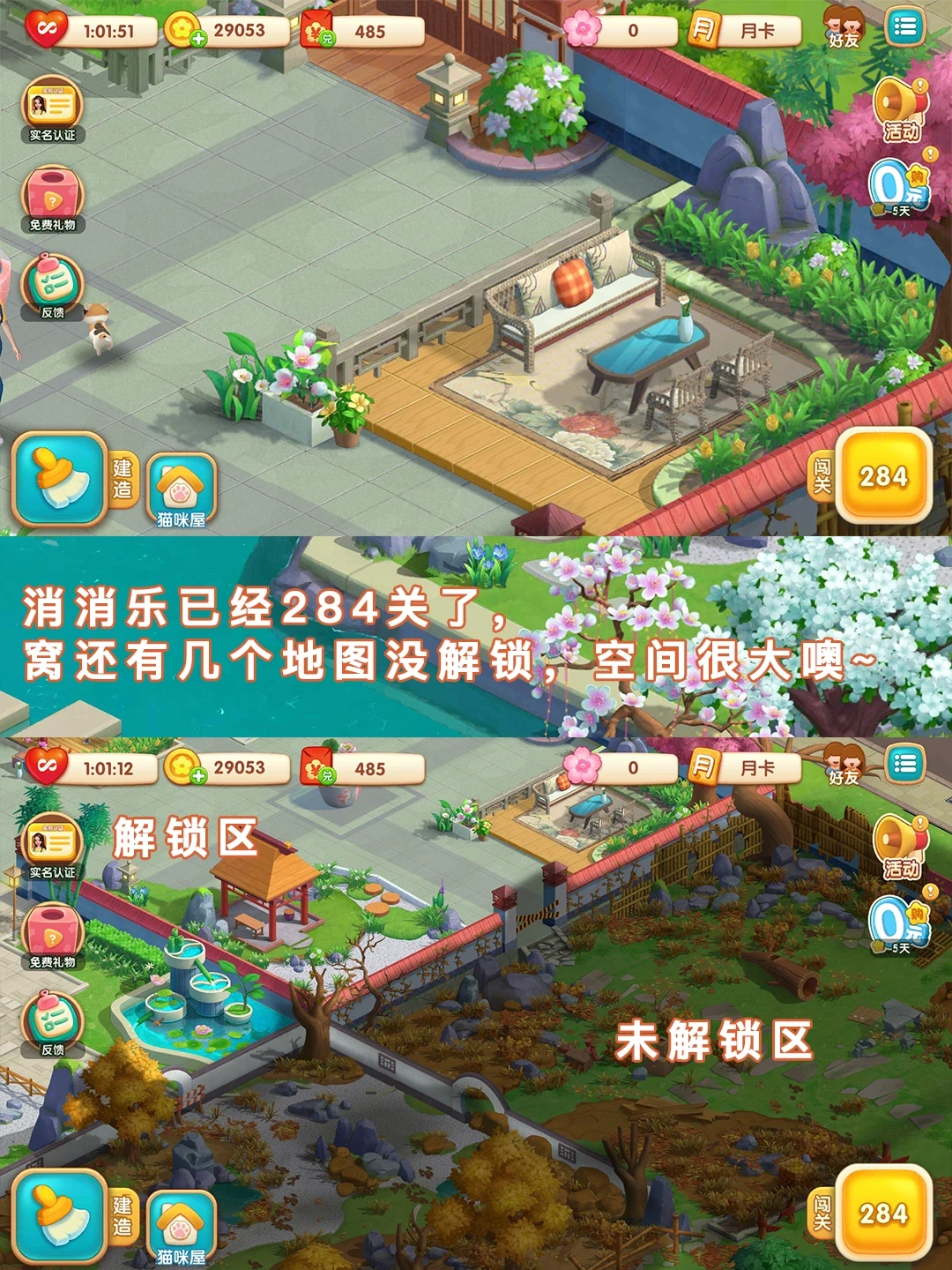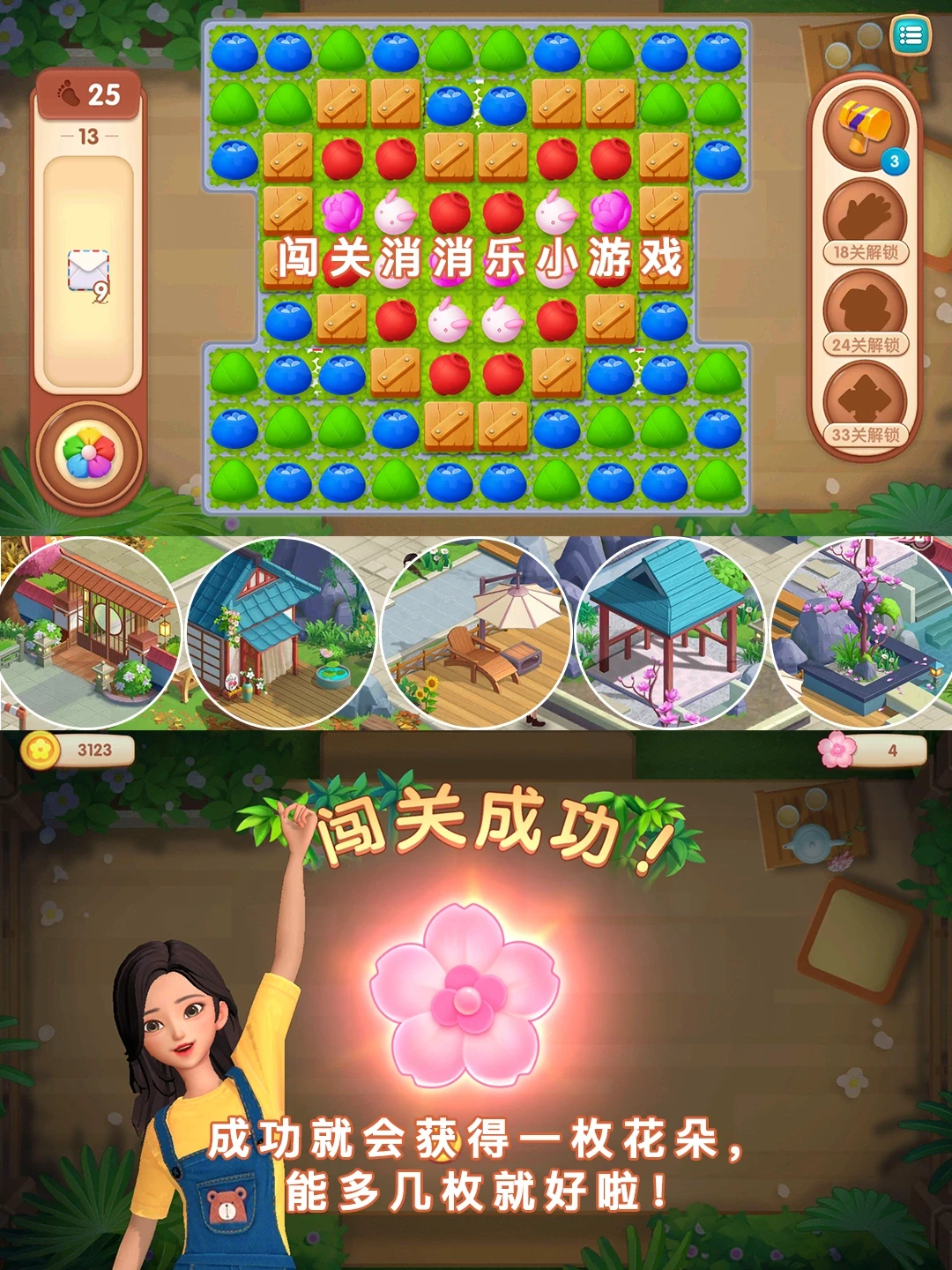 推动民宿的建设进度,需要我们去闯关消消乐小游戏,通关一个消消乐游戏就会获得一个🌸小花朵,
