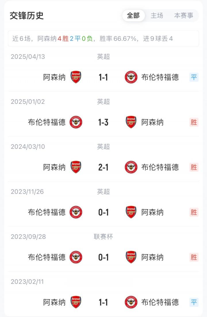 阿森纳联赛9胜3平1负积30分暂居英超榜首,各项赛事已连续17场不败;布伦特福德联赛6胜1平6负积19分暂位英超第12,各项赛事近7场2负。阿森纳对阵布伦特福德已连续9场不败(7胜2平),主场对阵布伦特福德已87年保持不败。