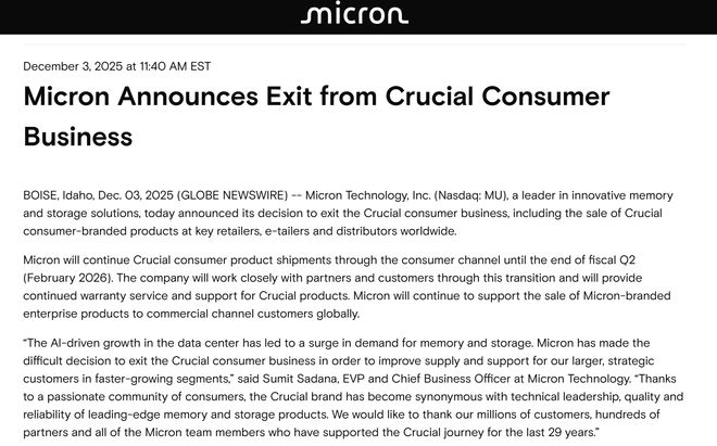 在周三发布的公告中,美光宣布退出Crucial(国内译为英睿达)消费业务,现有的库存将销售到本财年第二季度(2026年2月)末。公司将继续向全球商业渠道客户供应美光品牌的企业产品,同时现有产品的保修不受影响。