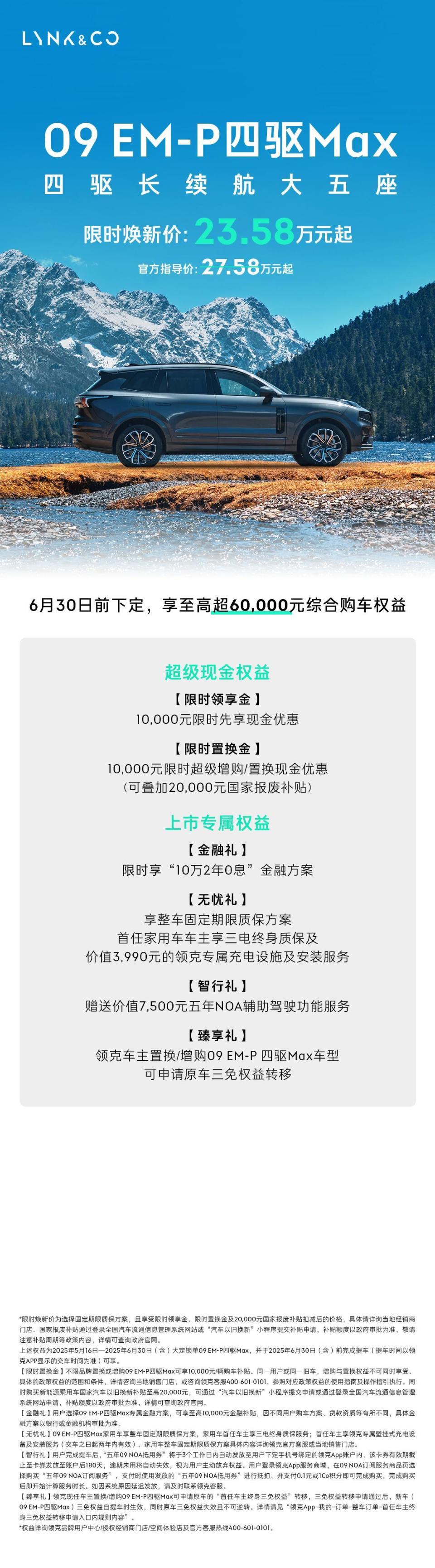 领克09 EM-P四驱Max大五座,不仅满足当代年轻用户对大五座插混SUV多样化出行的需求,更是送上六重福利。用户在6月30日前下定享至高超60000元综合购车权益,包括10000元限时领享金、10000元限时超级增购/置换现金优惠(可叠加20000元国家报废补贴)、“10万2年0息”限时金融方案、价值7500元五年NOA辅助驾驶功能服务、整车固定期限质保方案、首任家用车车主享三电终身质保及价值3990元的领克专属充电设施及安装服务。此外,领克车主置换/增购09 EM-P四驱Max车型可申请原车三免权益转移。多重福利加持,助力用户轻松拥有全场景自由出行体验。