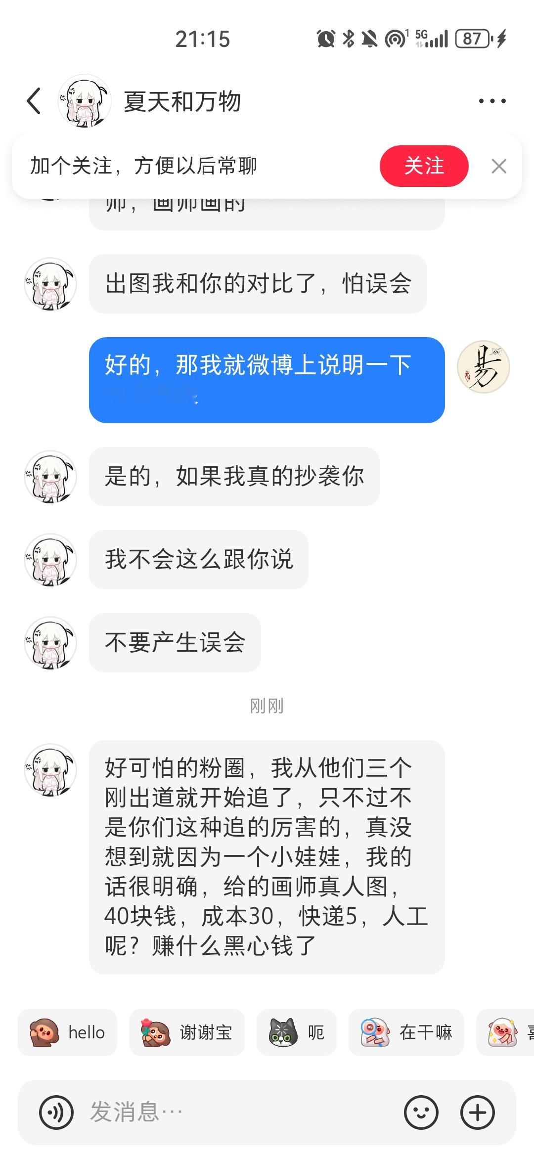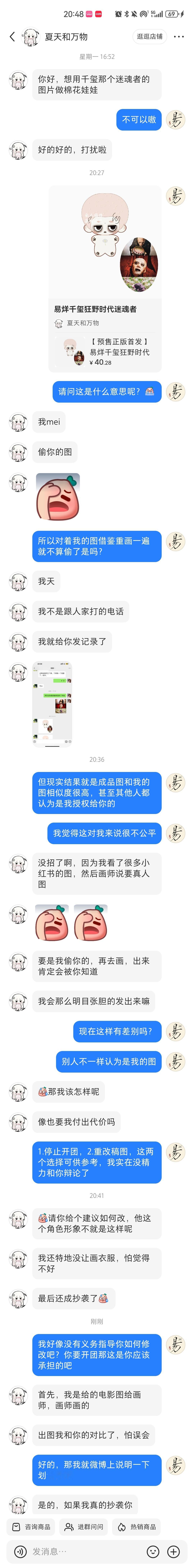 真的很累,真的很烦辩论首先,她先来找我授权想做棉花娃娃,我拒绝了。然后隔了几天就出一个相似度很高的娃开团,并且声称是自己发的真人图找别人约的稿,然而结果是成图让别人一看就觉得是我的图。我提了两个建议,当然都没有下文,我也没精力继续拉扯了,嗯就这样吧 二编原来是团粉啊……