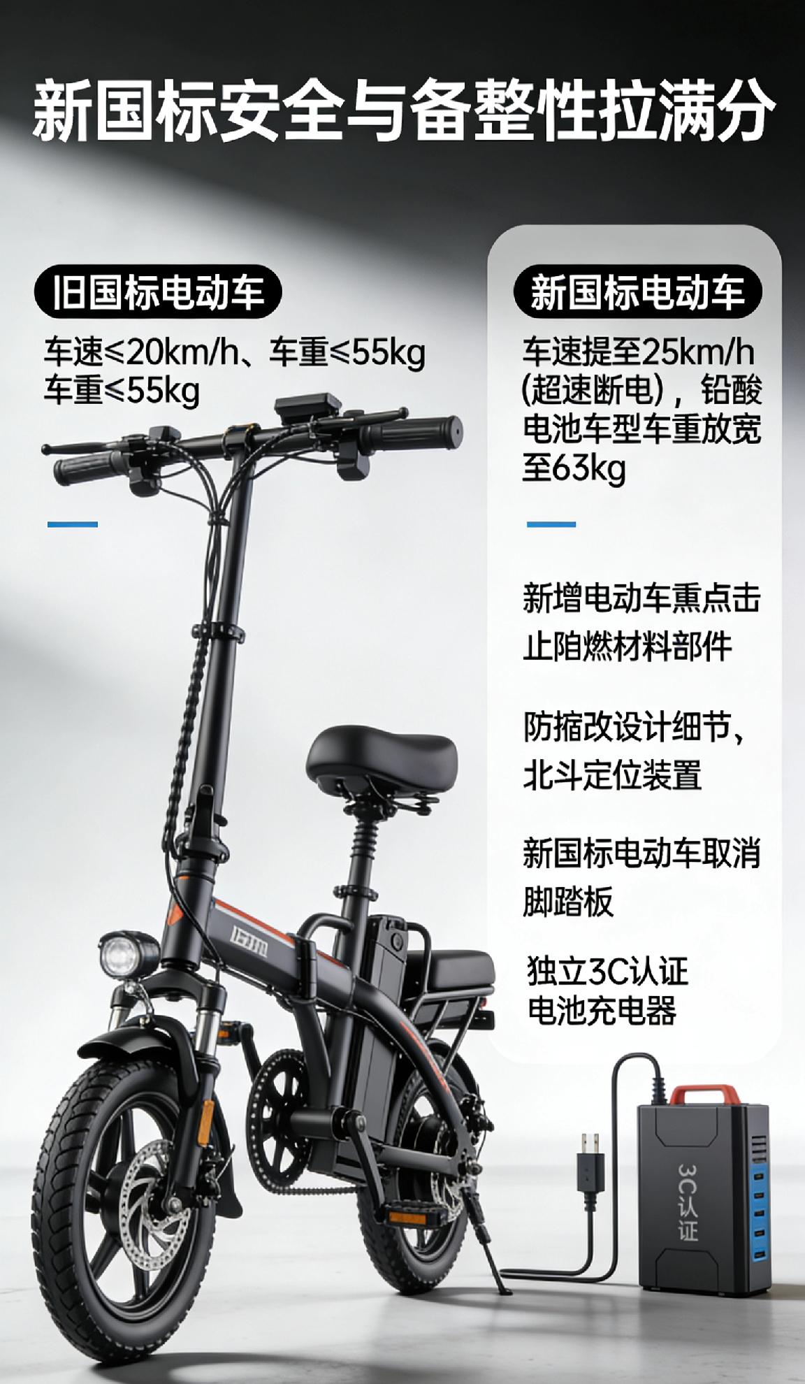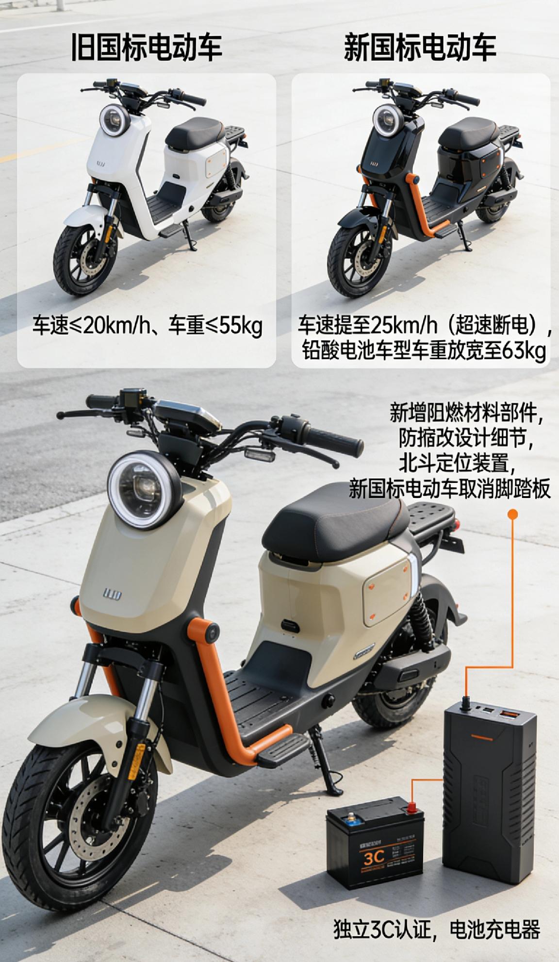 电动车新国标与旧国标有何不同电动车新国标比旧国标更注重安全与实用!旧国标车速≤20km/h、车重≤55kg,新国标车速提至25km/h(超速断电),铅酸电池车型车重放宽至63kg。新增阻燃材料、防篡改设计和北斗定位,取消强制脚踏,电池充电器需独立3C认证,安全与合规性拉满~ 新电动车新规 电动车规定 电动自行车国标