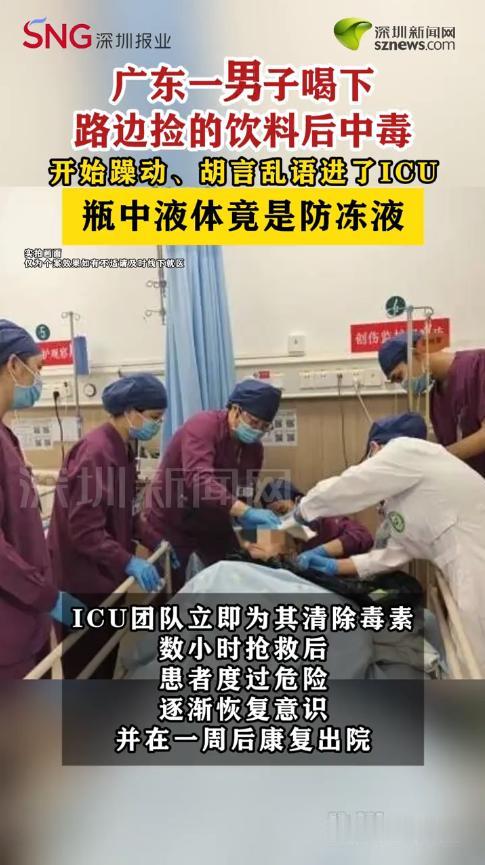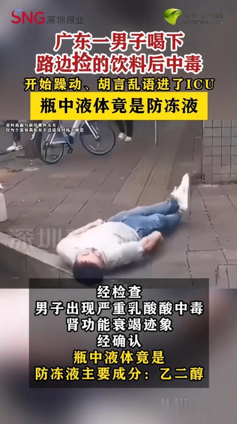 悲剧还是发生了!近日,广东广州,一男子在路边捡到瓶“饮料”,打开后闻到有些甜,就尝了几口,没想到过了一会,男子就出现头晕、胡言乱语等症状,送往医院后,被诊断为急性化学中毒!原来,男子喝的是防冻液。网友:胆子真大! 随着气温逐渐降低,有些地区已经降至零下,司机们一定要及时更换汽车的玻璃水,防冻液如果不够的话也要及时添加,但多余的防冻液千万不能乱放,因为它们非常危险。 据媒体12月3日的报道,当天下午,男子正走在马路边,忽然他被前方地上的一个饮料瓶吸引,里面装着颜色鲜艳的液体,打开后还能闻到一股甜味。 男子误以为是谁买的饮料掉了,就喝了几口,入口的味道不仅甜,还有些酒精的感觉,男子并没有在意,可是过了一会儿,他就感觉有些头晕,走路也不稳,于是赶忙回了家。 可是男子的状况迅速恶化,不仅变得异常暴躁,还开始胡言乱语,看起来就像喝醉了一样,家人急忙将他送去医院检查。 医生诊断后发现,男子虽然表现得像喝醉了酒,但却更像是脑卒中,但检查过后并没有异常,经过详细的询问,这才得知可能是“饮料”有问题。 果不其然,经检验,那是一瓶防冻液,男子属于化学物中毒。 经过一周的治疗,男子终于转危为安并顺利出院。 防冻液的颜色多种多样,所以一定要放在安全的地方保存,以免被误以为是饮料服用。 信息来源:《男子马路边捡到一瓶”饮料” 闻到淡淡的甜味 尝了几口结果进ICU》广州日报