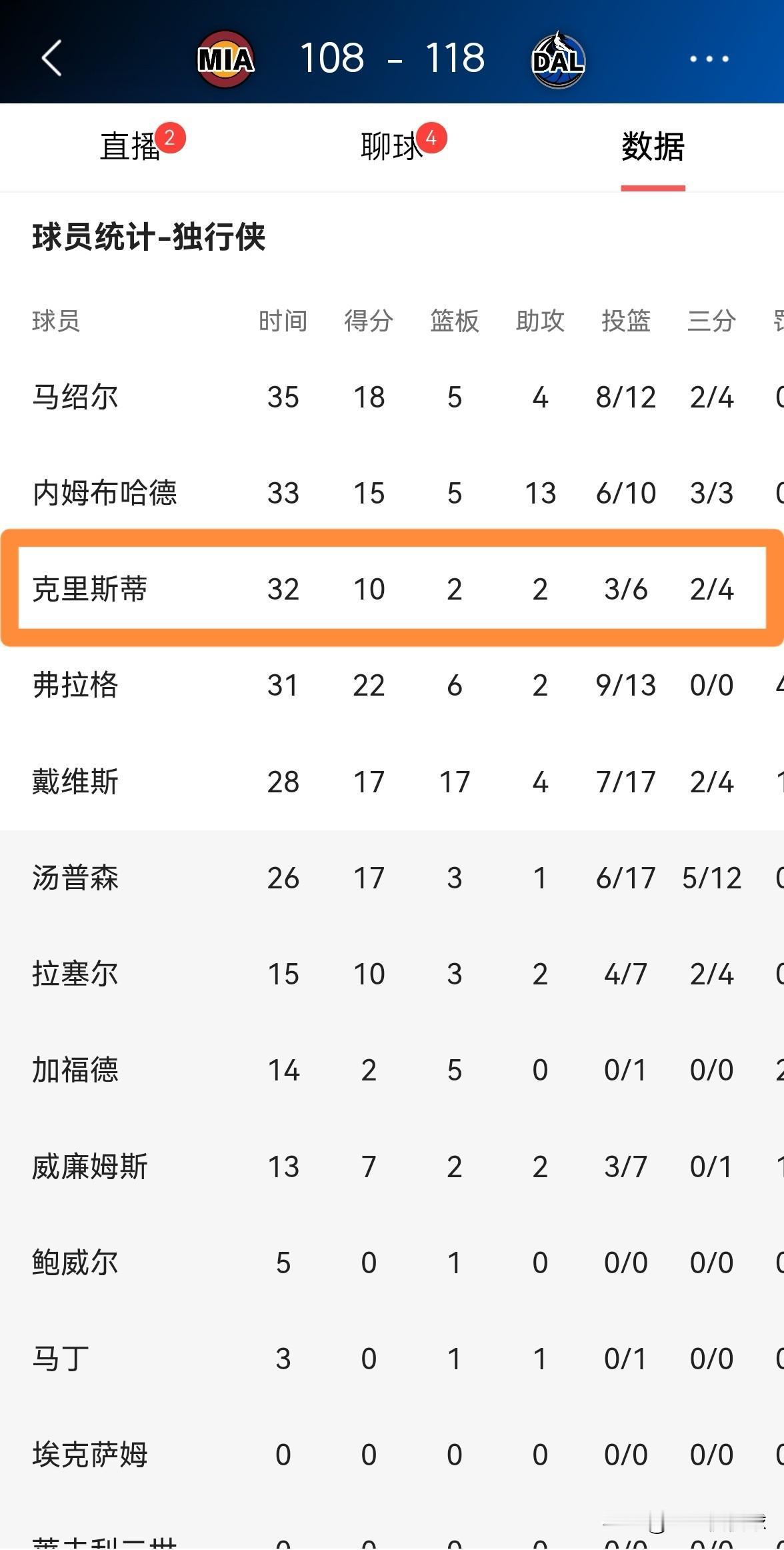 我忍不住要怒批独行侠新星克里斯蒂!在今天独行侠主场以118:108战胜热火的比赛中,小将克里斯蒂首发出战32分钟,投篮6中3,其中三分球4中2、罚球2中2得到10分2篮板2助攻,他的场上正负值为+18。虽然克里斯蒂本场比赛的表现非常出色,但是我依然要怒批他,因为他在手感出色的情况下仅仅出手6次,导致自己的得分仅有10分,这是非常不对的,他只有增加自己的出手数得到更多的分,才能提升自己的球队地位。
