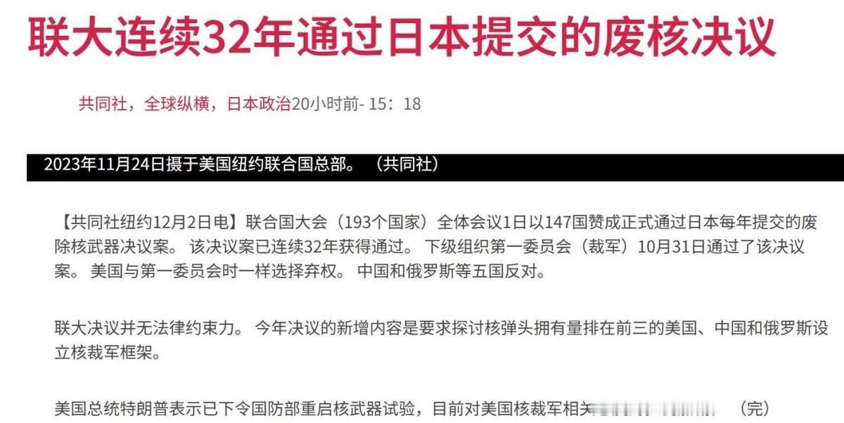 147:5!中俄反对无效,联大通过决议   据共同社报道,日前,联合国大会以147票赞成的高票,通过了日本提交的废核决议案,这是日本第32次在联大做这种动作。美国选择弃权,中国、俄罗斯等5国明确反对。   今年的案子里,日本加了新的段落,不再只是老套的核裁军口号,而是专门加入针对中国的内容,炒作所谓“中国核威胁”,要求搞一个中美俄三方核裁军框架,理由是“中国核弹头数量仅次于美俄”。     这套说辞没有事实支撑。全球核弹头的实际数量是各国最高机密,国际间流传的数据都是估算值,更何况中国一直执行“不首先使用核武器”的政策,核库规模远小于美俄。   就连美国国务院在最新的《中国军力报告》里,即便是刻意夸大,也只能承认中国的核弹数量是美国的零头。   真正需要承担核裁军大头的,是美国这种拥有全球最大核库,还扬言重启核试验的国家,而日本却对美国的扩核视而不见,反而紧盯中国防御性核力量,这种选择性失明的做法,已经说明他们根本不是真心为了核安全。   如果真要谈核风险,日本自己就是一个不能忽视的隐患,国际原子能机构最新数据表明,日本已储存47.8吨分离钚、1.2吨高浓度铀,还有冷战时期美国秘密移交的331公斤武器级钚,按每枚核弹需要6-8公斤钚来算,这些存货足够造出600到1360枚实战核弹头,宽泛估算甚至能达到上千枚。   这并不是虚惊——日本青森的再处理厂一年就能提取8吨钚,而福岛事故后日本核反应堆只剩9台在运行,用的都是低浓度铀燃料,实际钚消耗远少于产量,也就是说,大量钚库存根本用不上民用发电,却还在持续增加,这和所谓的“民用核能”完全对不上号。   更关键的是,日本既有技术也有能力在短时间内量产核武器。它是《不扩散核武器条约》里唯一同时掌握后处理技术、能提取武器级钚并拥有运行设施的“无核国”,基辛格曾警告,日本可能在2028年前拥核,如今看这个趋势,不是危言耸听。   近年来,从安倍晋三政府强推《新安保法》、解禁集体自卫权,到高市早苗主导的修宪议程,日本一直在松动战后束缚,现在更公开讨论修订安全文件,删除无核三原则里的“不引进”条款,允许美军把核武器带入日本。一旦成真,这将是他们跨过核门槛的重要一步。   与此同时,日本还努力把核政策和涉台议题绑在一起。高市公开宣称“台湾有事”就是“日本有事”,借此为军事介入台海找借口。   更有智库搞兵推,建议美国用核武器威慑中国。在军事动作上,日本在西南诸岛加快部署导弹和电子战力量,明显是针对中国的战略布局,这种一边扮演“和平使者”、一边推动核讹诈的行径,早已砸碎了其反核形象。   再回到这份决议案,日本在联大的高调,不过是另一层表演,他们打着“核爆受害者”的旗号博取舆论,却对《禁止核武器条约》漠不关心,拒绝加入,甚至不派高层出席相关会议。   对比之下,中国的立场一贯明确:维护全球战略稳定,通过对话推动核裁军,但绝不接受基于虚假信息、损害中国安全利益的安排。   需要记住的是,联大决议并无法律约束力,能形成实质行动的只有安理会决议,在2025年抗战胜利80周年这一历史节点,日本右翼的核动作不仅无视历史教训,更在加剧地区紧张。   国际社会应认清,日本的所谓“废核”不仅不能减核,反而破坏全球核军控的平衡。