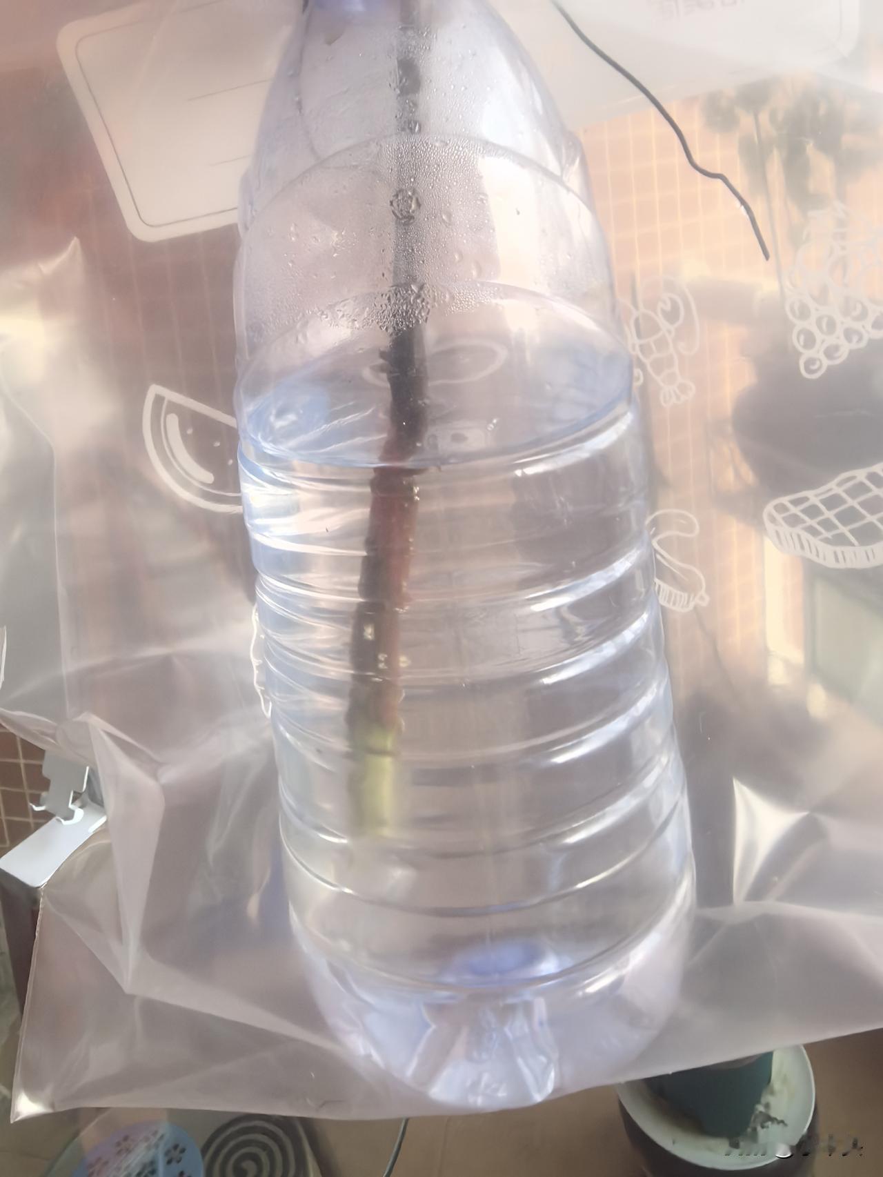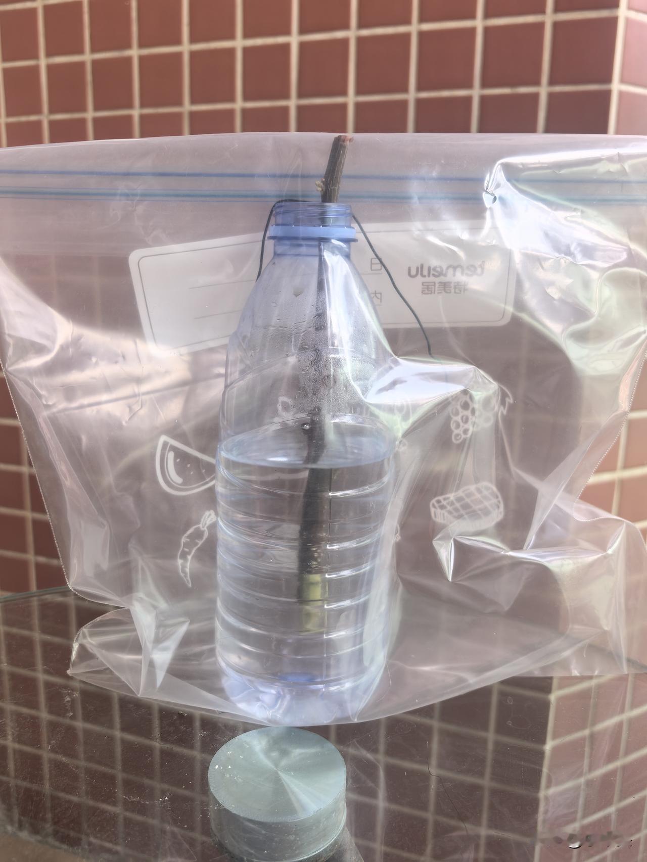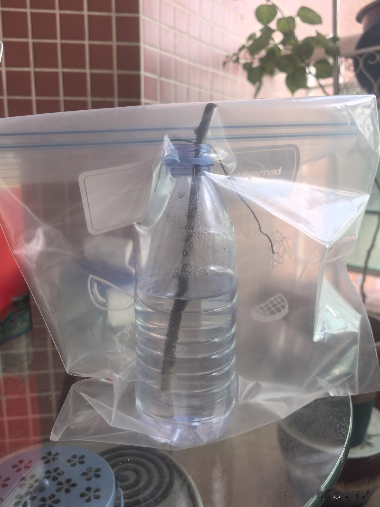 上个月,把扦插、水培中的三角梅全扔掉后,心有不甘。于是,又找来一个矿泉水瓶,倒进清水,把三角梅底部削皮,放进瓶中,再用密封袋封住!放在阴凉通风的地方。没想到,不到十天时间,已长出了很多芽点,看来这个方法可行! 三角梅 三角梅培植 三角梅扦插