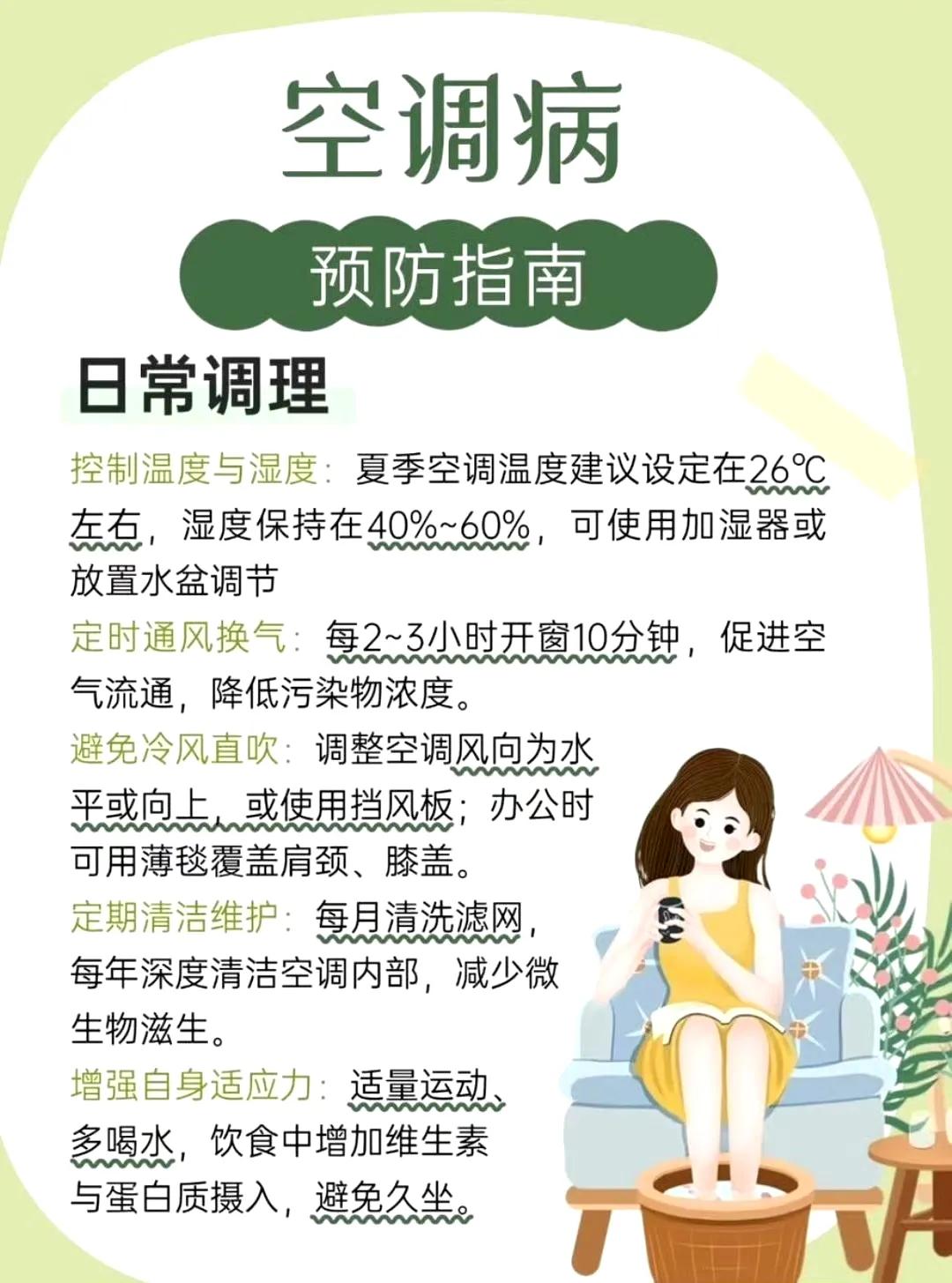 空调病不是“矫情病”!三伏天科学降温,牢记这4点 近日,全国多地开启“蒸烤模式”,空调成为救命神器,但“空调病”也频频登上热搜。有人头疼流涕,有人关节酸痛,甚至有人因长时间吹空调住进医院。网友调侃:“夏天命是空调给的,病也是空调送的。”究竟如何正确预防空调病?今天说点大实话。 一、空调病不是“病”,但危害真实存在 医学上并没有“空调病”这个诊断名词,但它背后反映的是密闭环境下的健康隐患:冷空气刺激呼吸道、干燥空气加速水分流失、室内外温差导致血管痉挛……这些都可能引发鼻塞、头痛、皮肤干燥、关节疼痛等症状,甚至诱发慢性病。 关键矛盾在于:我们误解了“降温”的本质。空调的目标是让人体舒适,而非追求低温。许多人把空调当“冰箱”,24℃以下才觉得爽,这才是病根。 二、预防空调病,记住4个“不” 1. 温度不“贪低” 26℃是人体最舒适的温度,室内外温差建议控制在8℃以内。比如室外35℃,空调开到27℃即可。夜间睡眠时可调至28℃+微风模式,避免直吹。 2. 空气不“死循环” 空调房每3小时开窗通风10分钟,否则二氧化碳浓度上升会让人头晕。有条件的话,搭配空气净化器或加湿器(湿度保持在50%-60%最佳)。 3. 身体不“硬扛” 办公室常备薄外套,重点保护颈椎、膝盖等易受凉部位。冷风避免直吹,可调整叶片朝上。久坐人群每隔1小时活动5分钟,促进血液循环。 4. 清洁不“偷懒” 空调滤网积攒的霉菌、灰尘是过敏原,至少每月清洗1次(可用专用清洁剂或50℃热水浸泡)。多年未深度清洁的老空调,建议找专业人员处理。 三、特殊人群要当心 老人、儿童、孕妇及关节疾病患者对温度更敏感。建议儿童房间空调温度比成人高1-2℃,老人睡前关闭空调改用电扇摇头模式。 空调病的本质是“不会用空调”。科技本该服务生活,而非制造麻烦。这个夏天,与其抱怨“离不开空调”,不如学会与它和平共处——毕竟,健康才是最大的清凉。