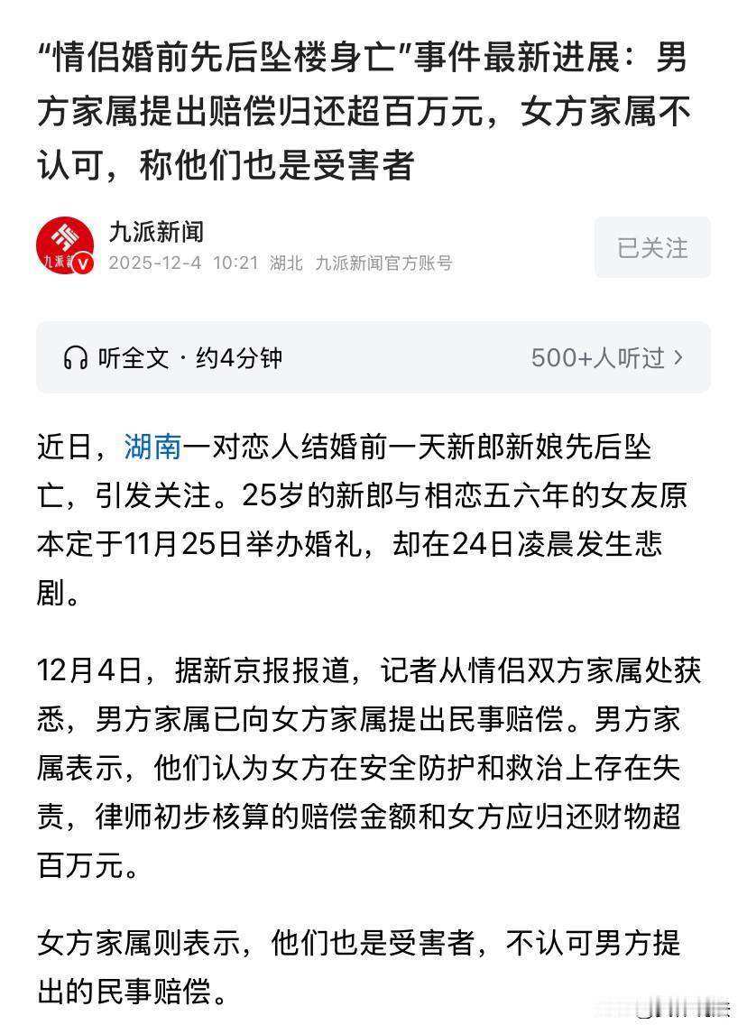 湖南,25岁新郎与相恋5、6年的女友在结婚的头一天,先后与女友从女友家中4楼坠亡。事情刚刚过去仅仅9天,又传出新消息,男方家人欲向女方家人索赔157万余元,理由是认为女方在安全防护和救治上存在失责。不过,女方家人不认可,表示自身也失去了一个女儿,是受害者。 据悉,事情大概是这样的。25岁男子曾某有房有车无贷款,而且年纪轻轻已经开了3家早餐店,经济条件优渥。 前不久,曾某与相恋了5、6年的女友阳某打算结婚,并将结婚的日子定在11月25日。 11月23日,曾某、阳某一同宴请朋友后,便返回阳某家中。 结果,当天早晨7点40分左右,阳某的母亲起床后发现曾某从4楼坠亡。 阳某的母亲慌了,当即便把阳某叫醒下楼。 谁料,阳某目睹了曾某的尸体后,二话没说,当即返回4楼,也从4楼跳了下去,与曾某双双坠亡。 到底是什么原因才酿成了这样的悲剧? 事后,警方发现当日5时4分时,曾某曾给阳某打过视频电话,第一次拨通未接通,第二次接通了不过只有4秒。虽然头一天晚上,曾某喝了些酒,但是监控显示曾某到达阳某家下车时不太平稳,并无明显醉酒的状态。初步推断曾某是酒后上厕所走错门误坠,并排除了刑事案件的可能。 不过对于“误坠”这样的说法,阳某的家人明确反对,表示曾某并不是第一次来家中,很熟悉家里的环境,且无醉酒迹象。 曾某的家人也不认可!并提出“两个人明明睡在一起,为什么要打电话的”疑问! 事情发生后,有人猜测曾某与阳某是因为彩礼,有人说是新娘未婚先孕。不过也都被双方家人否认。 当天晚上到底发生了什么?暂时还无人能够说得清! 不过,虽然如此,曾某的家人认为曾某是在阳某家中坠亡,退一步说就算曾某是“误坠”也说明阳某家在安全防护存在问题,没有第一时间发现曾某坠楼并给予救助,也存在失职,如今要求阳某家归还财物并赔偿丧葬费、赡养费等等共计157万余元。 对此,阳某的家人则表示,他们也不愿意这样的悲剧发生,已经失去了一个女儿,也是受害者,不认可曾某家提出的赔偿。 那从法律上该如何看待此事呢?曾某的家人能否要求阳某的家人返还财物并给予相应的赔偿? 首先,彩礼又称订亲财礼、聘礼、聘财等,指的是男方在婚姻约定初步达成时向女方赠送的聘金、聘礼。在法律上来说是以结婚为条件的附条件赠与行为。 最高院《关于适用〈民法典〉婚姻家庭编的解释(一)》第5条规定:当事人请求返还按照习俗给付的彩礼的,如果查明属于以下情形,人民法院应当予以支持:(一)双方未办理结婚登记手续;(二)双方办理结婚登记手续但确未共同生活;(三)婚前给付并导致给付人生活困难。适用前款第二项、第三项的规定,应当以双方离婚为条件。 具体到本案,也就是说,曾某与阳某如果没有登记结婚,或者说已经登记结婚,还没有同居生活,或者同居生活的时间比较短,曾某的家人依法可以要求阳某的家人返还具有彩礼性质的财物。 其次,《民法典》第1165条规定,行为人因过错侵害他人民事权益造成损害的,应当承担侵权责任。 在民事侵权案件中,“过错责任原则”是核心。简单说,只有证明对方存在过错,并且这个过错和损害结果有直接因果关系,才能要求对方赔偿。 具体到本案,因为事发地在阳某家中,且曾某与阳某系即将结婚的新人关系,阳某一方对程某一方负有安全保障义务。 如果曾某的家人能够拿出充分的证据证明阳某家的房子存在安全问题、阳某一方在发现曾某坠楼后并没有第一时间救助,延误了对曾某的抢救,可以向阳某的家人主张赔偿。反之,则不能。 最后,不少网友表示,两个人都没了,对两个家庭都是致命打击,不管因为什么,而且女方是殉情,给两个人安葬在一起,不要再闹了! 确实,法律是解决纠纷的标尺,但不是抚平伤痛的良药!悲剧已经发生,无论责任如何划分,都无法挽回两条年轻的生命。 愿逝者安息,也希望本该成为亲家的双方的家人,能够友好协商处理处理后续的问题,尽快走出悲痛,重拾生活。 这事您怎么看?欢迎在评论区留言,与大家一起交流您的看法! ------ 关注@安律说法 案例中看人生百态,法律中寻破局之法