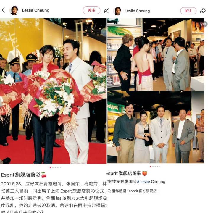 而香港成了品牌“逆势重启”的支点——作为Esprit最早进入的亚洲市场(1970年代初由邢李源引入),这里不仅承载着“软硬天师”歌词里的集体记忆,更有某社交平台博主@LeslieCheung晒出的明星剪彩旧照:2001年6月23日,张国荣、梅艳芳、林忆莲等港星冒雨出席上海Esprit旗舰店剪彩仪式,现场因张国荣的超高人气一度混乱,走秀被迫取消,粉丝还在雨中合唱《月亮代表我的心》。这些细节,都印证着Esprit当年的热度,曾是一代人眼中“时尚”的代名词。