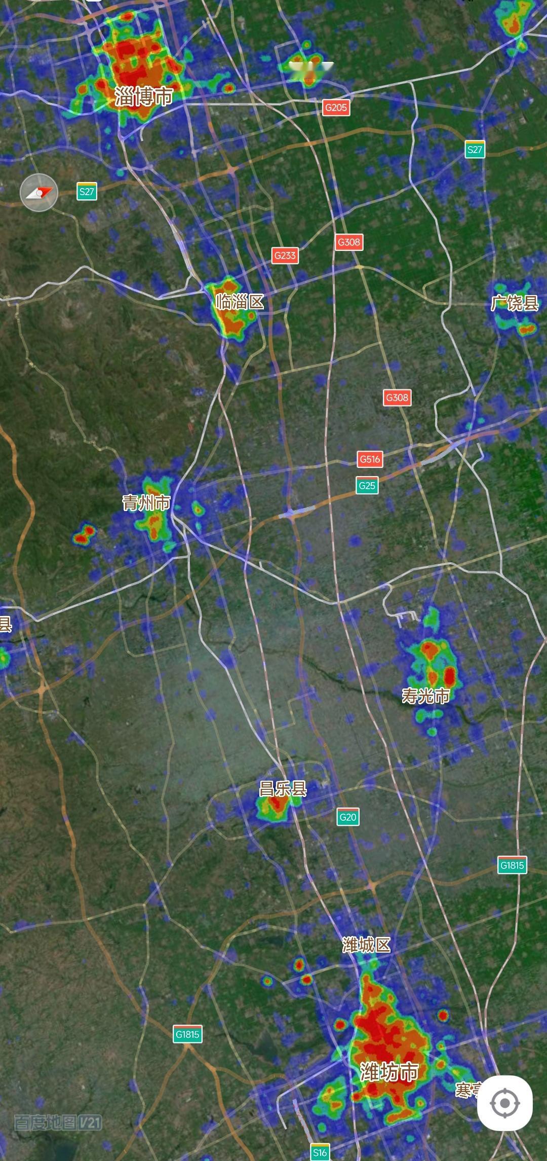众所周知潍坊人口数量931万,淄博人口数量只有463万,可以说人口规模这两个城市相差了1倍。然而从城市热力图看淄博市区的繁华程度跟潍坊市区旗鼓相当,仔细观察会发现淄博市区面积甚至比潍坊还略大一些。 这样看来淄博不愧是老牌工业城市,较高的城市化率让整个城市烟火气息十足。相比之下潍坊市区规模一般,主要是县级市发展得比较好,因此看到这两个城市的繁华程度旗鼓相当就不值得大惊小怪了。