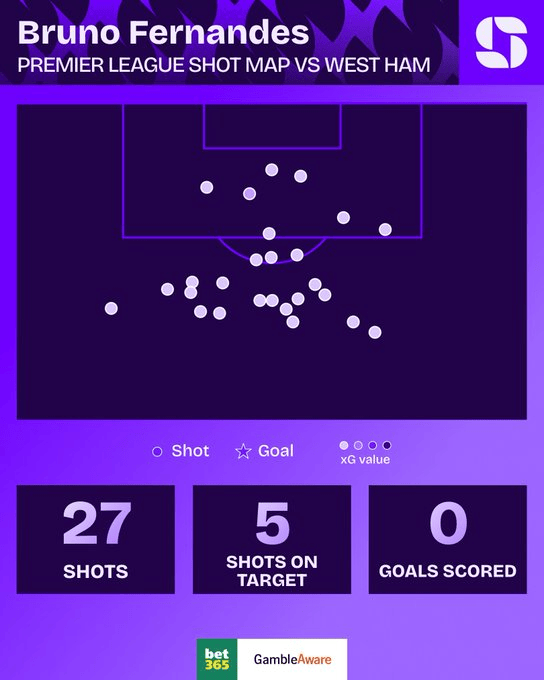 据Squawka统计,布鲁诺-费尔南德斯在英超中交手最多的球队就是西汉姆联(共11场比赛),但在这些比赛中,他没有进过球。