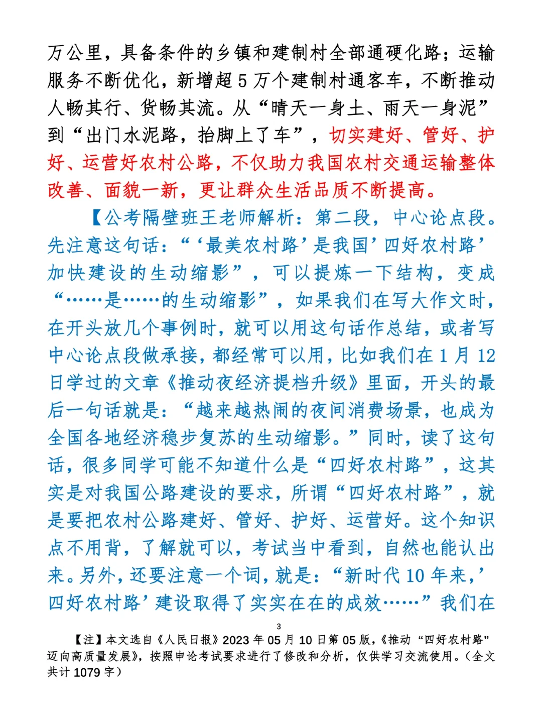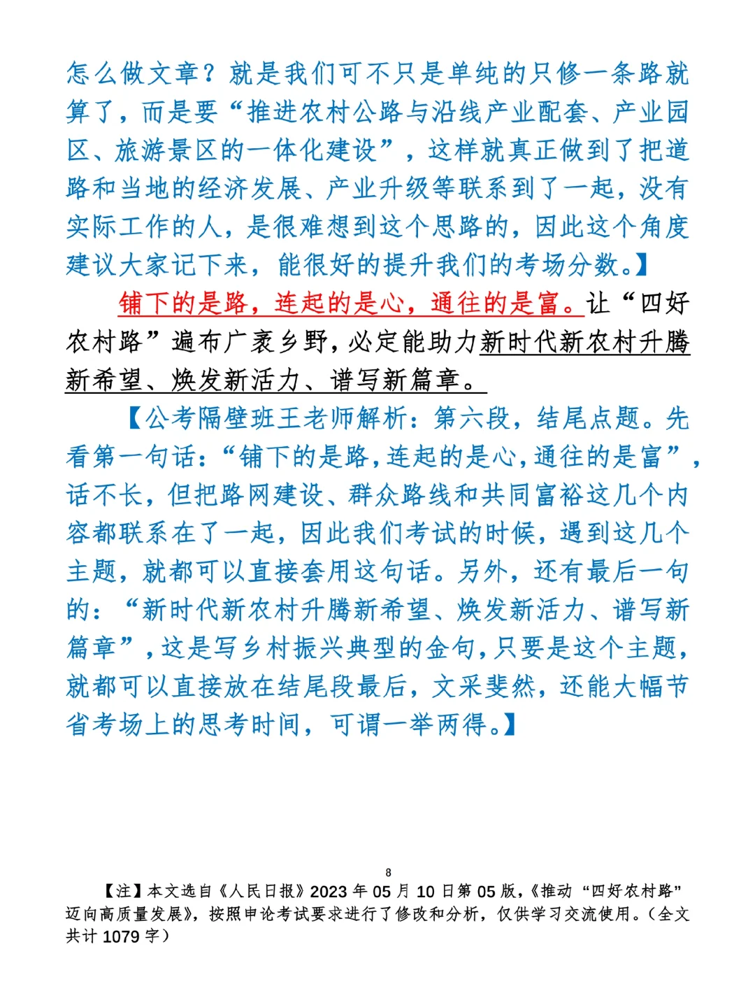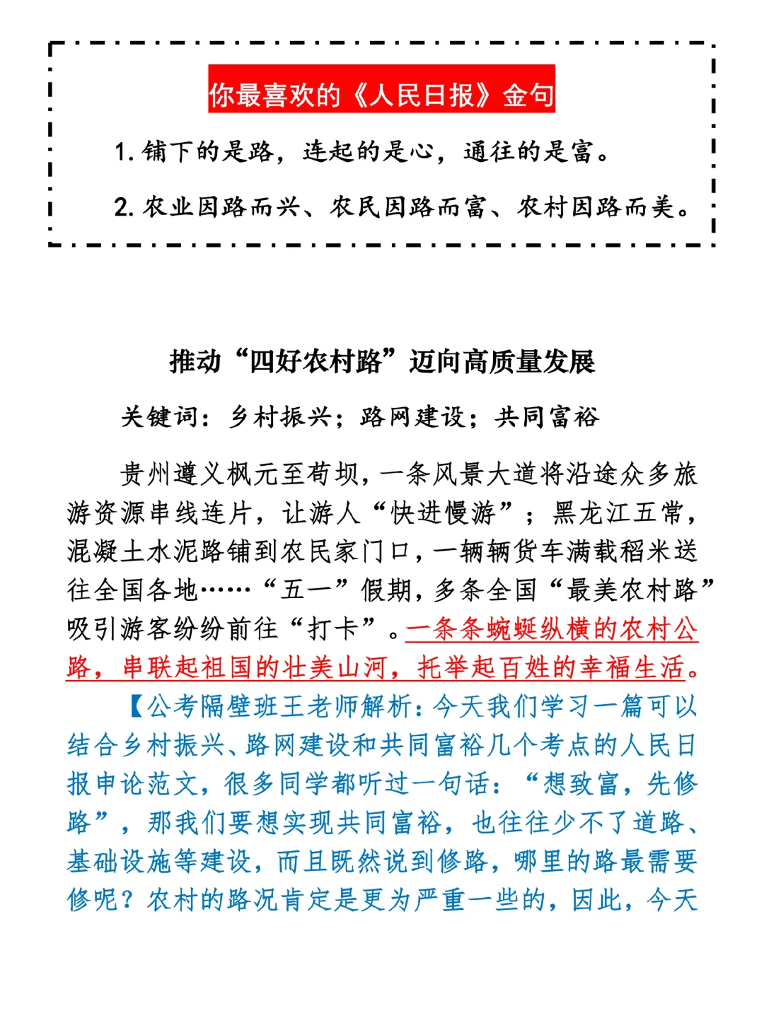 如何抄写:每日抄写文章发在“公考隔壁班王老师”账号,红色字是重点句和结构句,黑色字是正文,蓝色字是解析,大家抄写时不必抄蓝色字。建议先通读全文,做到心中有数再开始抄写,效果会更好。 关于文章:抄写文章来源于人民日报,但每篇文章我都根据申论考试要求进行了修改:一是重写或修改开头、结尾;二是统一段首句句式结构;三是调整段落字数,使文章结构更均衡;四是简化复杂长难句,使之更具可模仿性。每篇文章无论修改多少,都是基于申论考试要求,毫无对人民日报文章品评之意。(此处致敬人民日报)