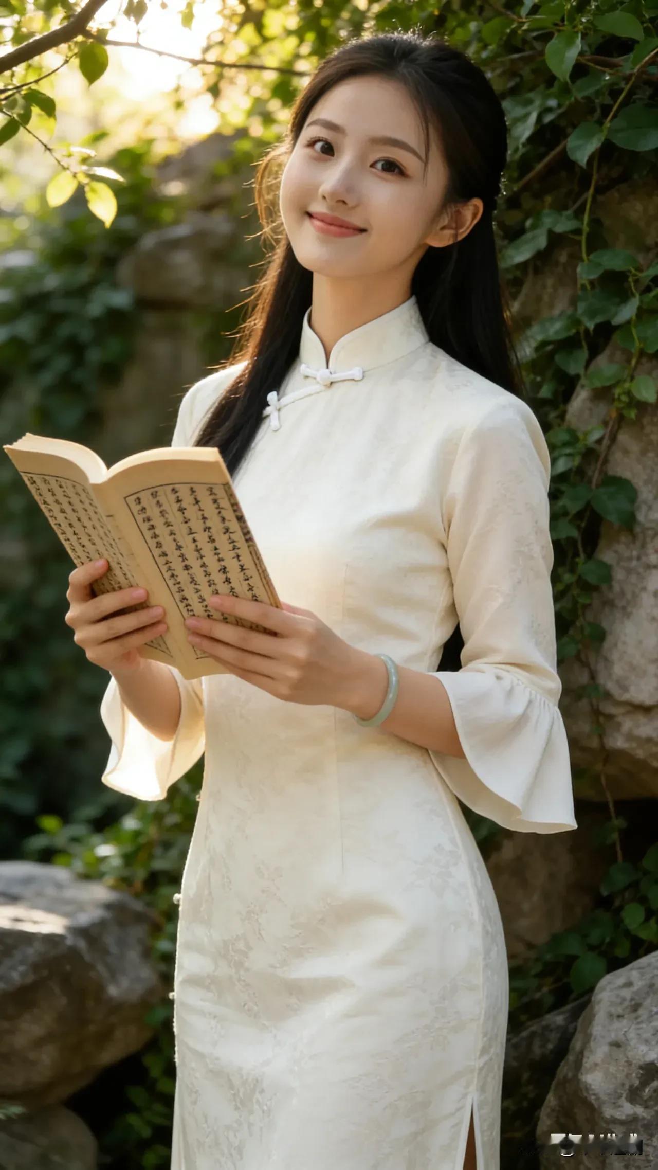 素旗袍裹着书卷气的柔,竹节镯碰着书页的轻。夕光漏过枝桠时,连字里行间都浸着江南式