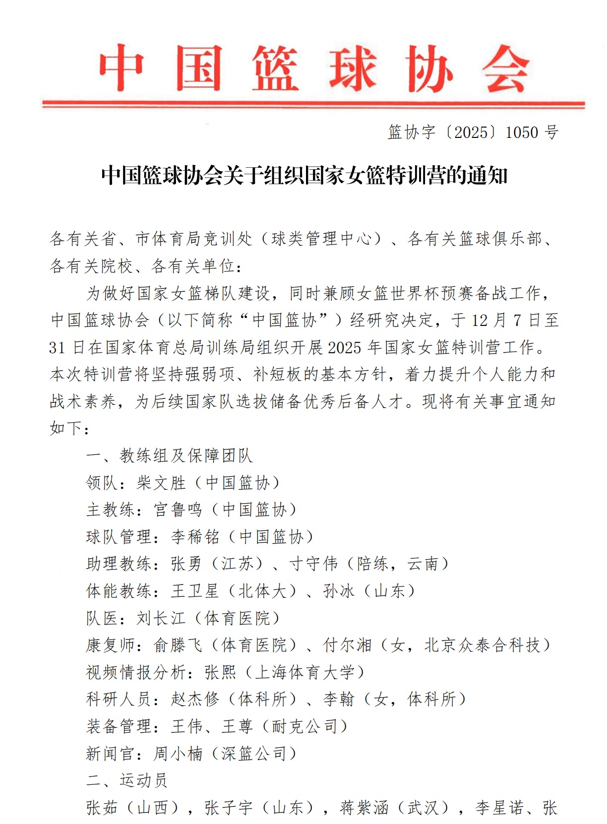 近日,中国篮协下发了关于组织国家女篮特训营的通知,来自武汉盛帆黄鹤队的球员蒋紫涵成功入选,将在12月7日至12月30日接受特训。