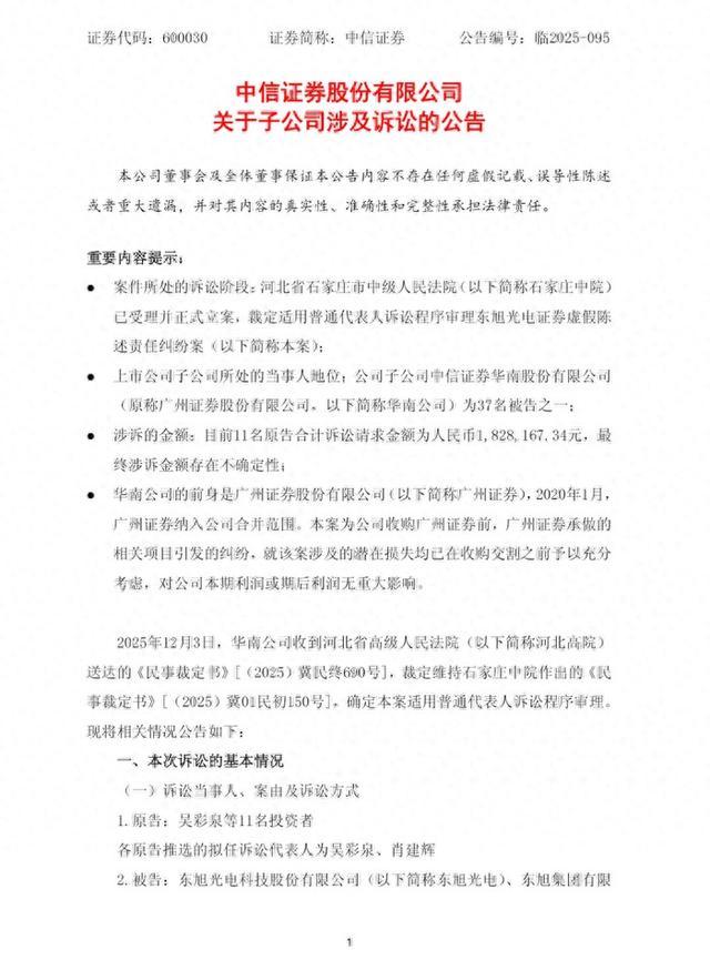 中信证券12月4日晚发布公告称,子公司中信证券华南股份有限公司因牵涉东旭光电证券虚假陈述责任纠纷案,被列为37名被告之一,涉诉金额182.82万元。该案已确定适用普通代表人诉讼程序审理,引发市场关注。