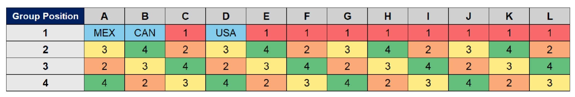 对于第2、3和4档的球队,每支球队的分组位置将根据预先设定的分配模式确定(如上图)。简单解释一下,举个例子,如果“第二档”的克罗地亚抽在G组,根据表格对应,他将作为G组的“3号球队”,这将会直接影响到球队的赛程顺序以及比赛场地的分配。