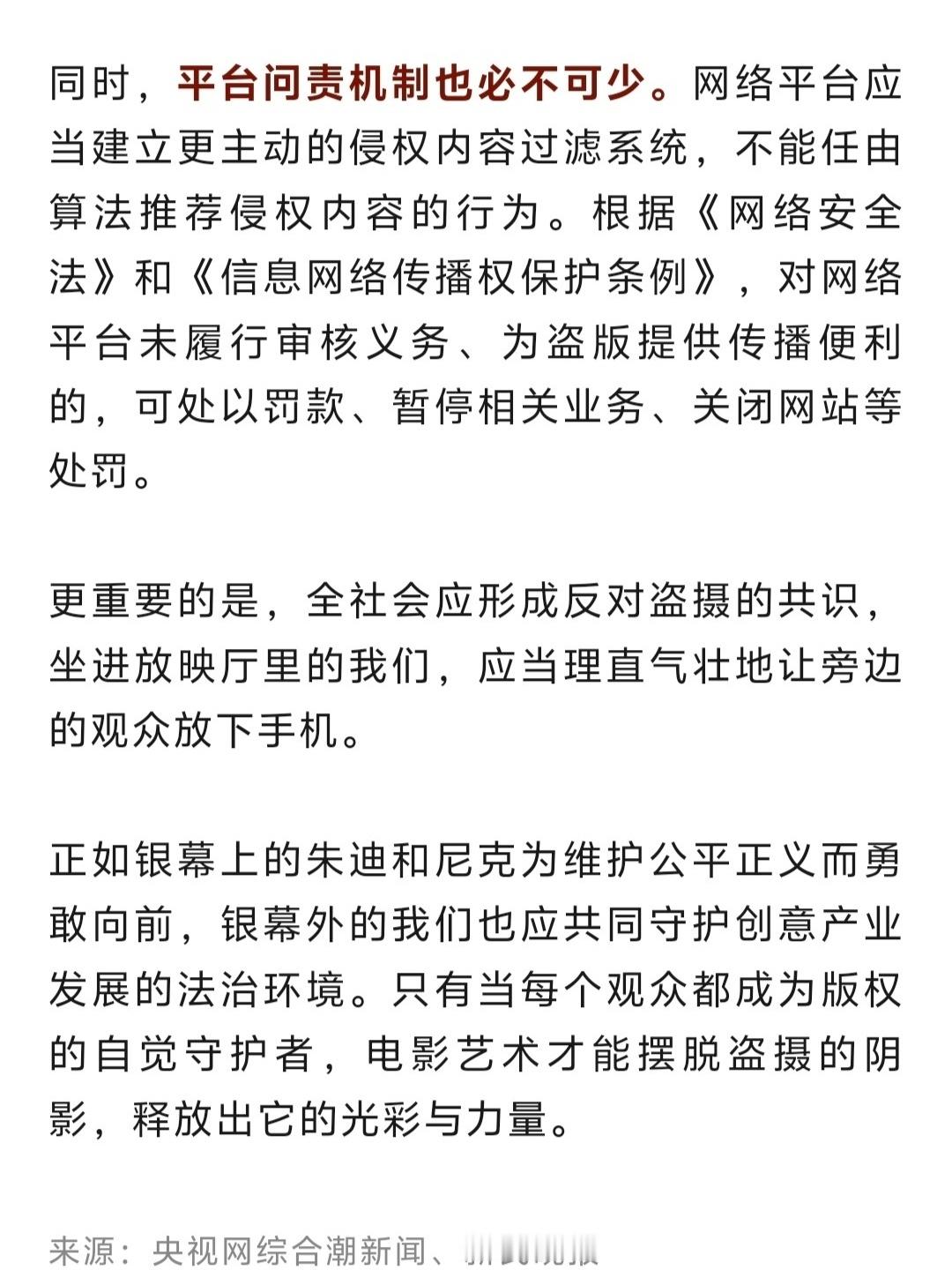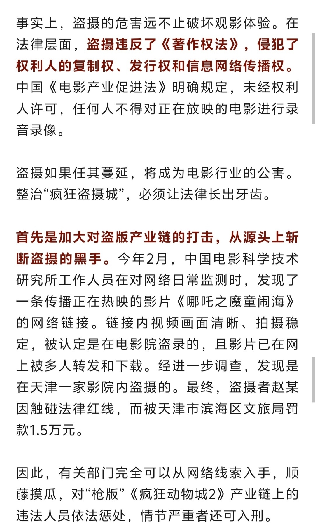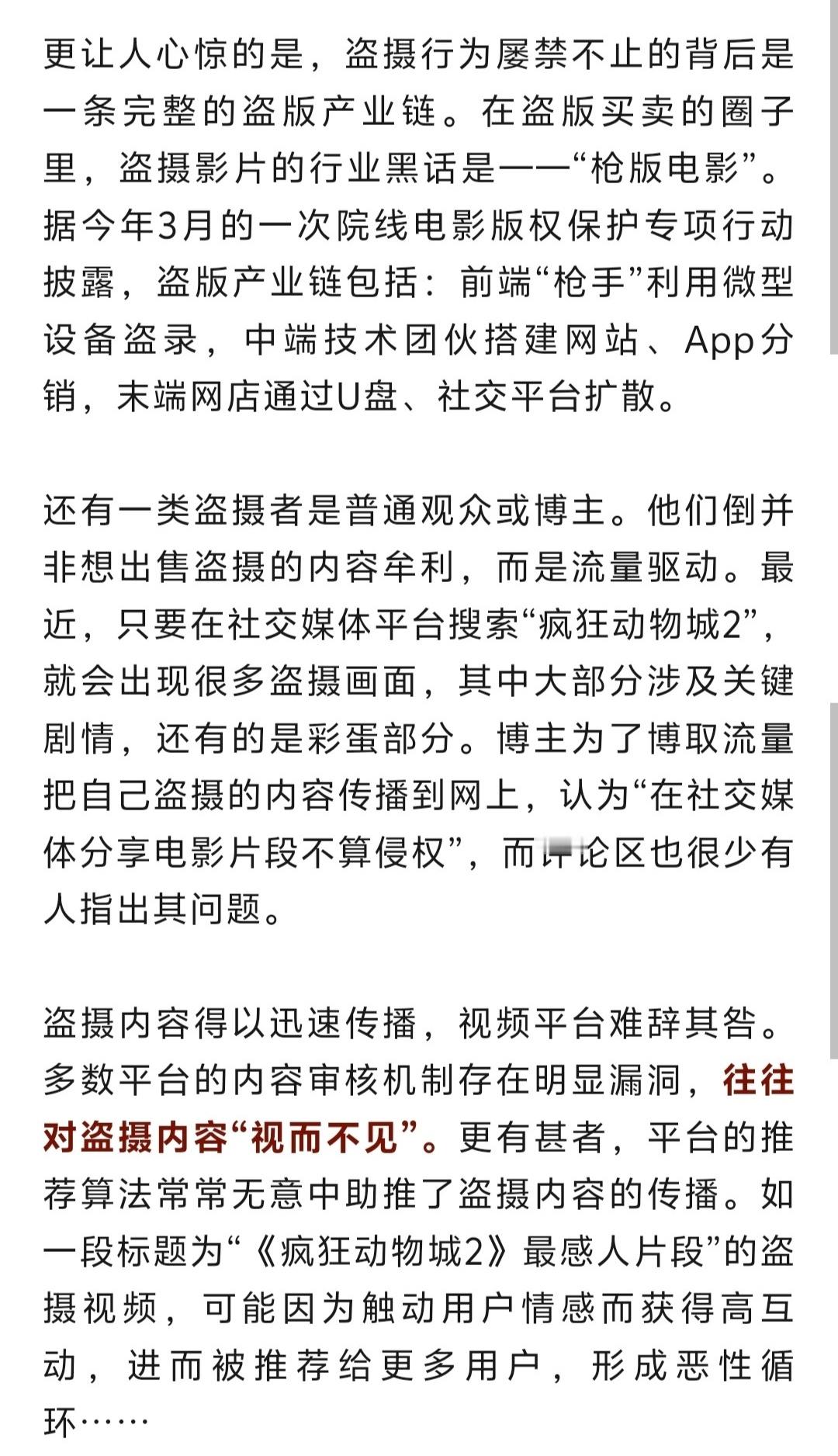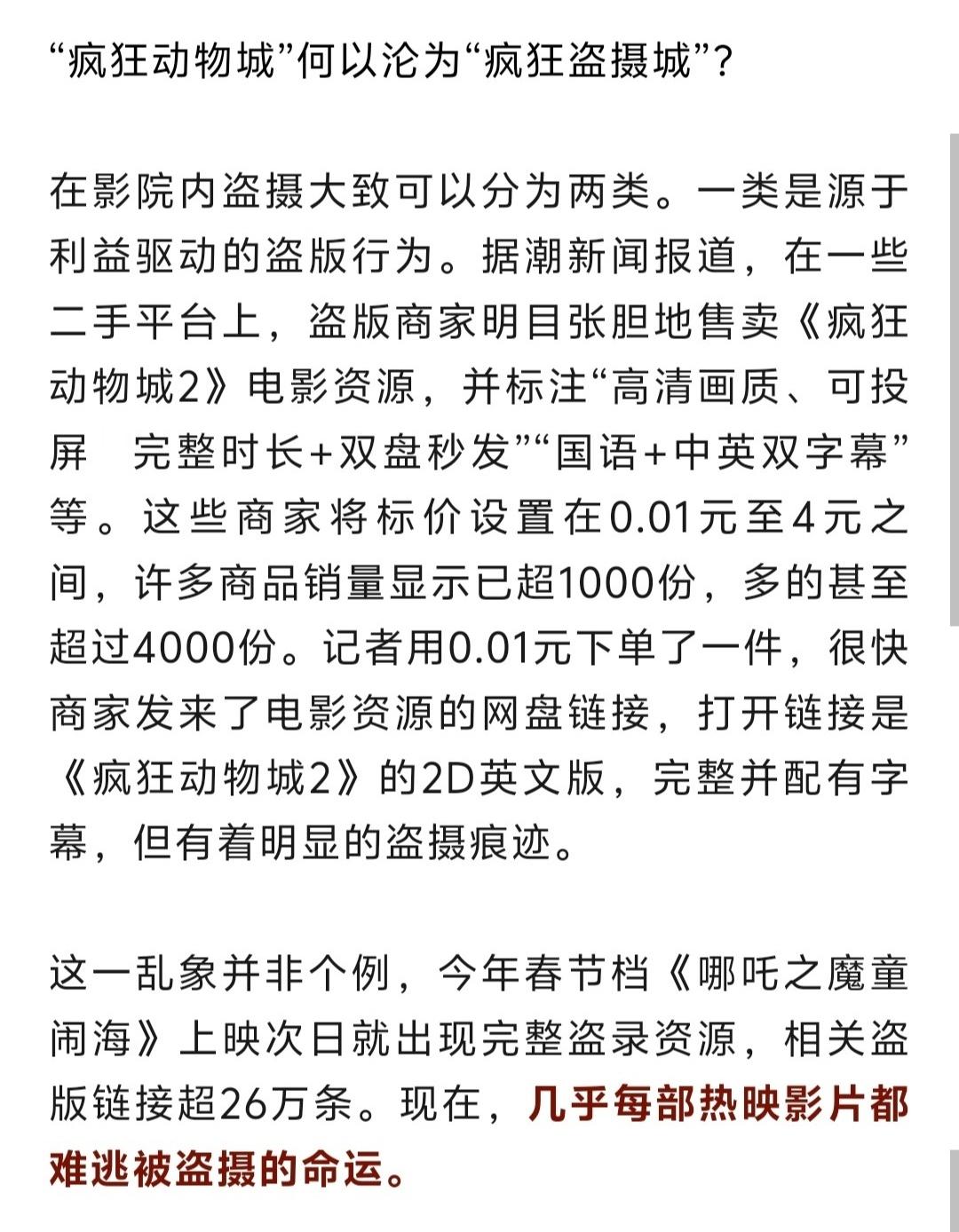 疯狂动物城2新华社发文疯狂盗摄城 新华社发文斥盗摄!“更重要的是,全社会应形成反对盗摄的共识,坐进放映厅里的我们,应当理直气壮地让旁边的观众放下手机。正如银幕上的朱迪和尼克为维护公平正义而勇敢向前,银幕外的我们也应共同守护创意产业发展的法治环境。只有当每个观众都成为版权的自觉守护者,电影艺术才能摆脱盗摄的阴影,释放出它的光彩与力量。”特别认同这段,只有每个人都出手,共同维护自己的权益,才有可能越来越好!