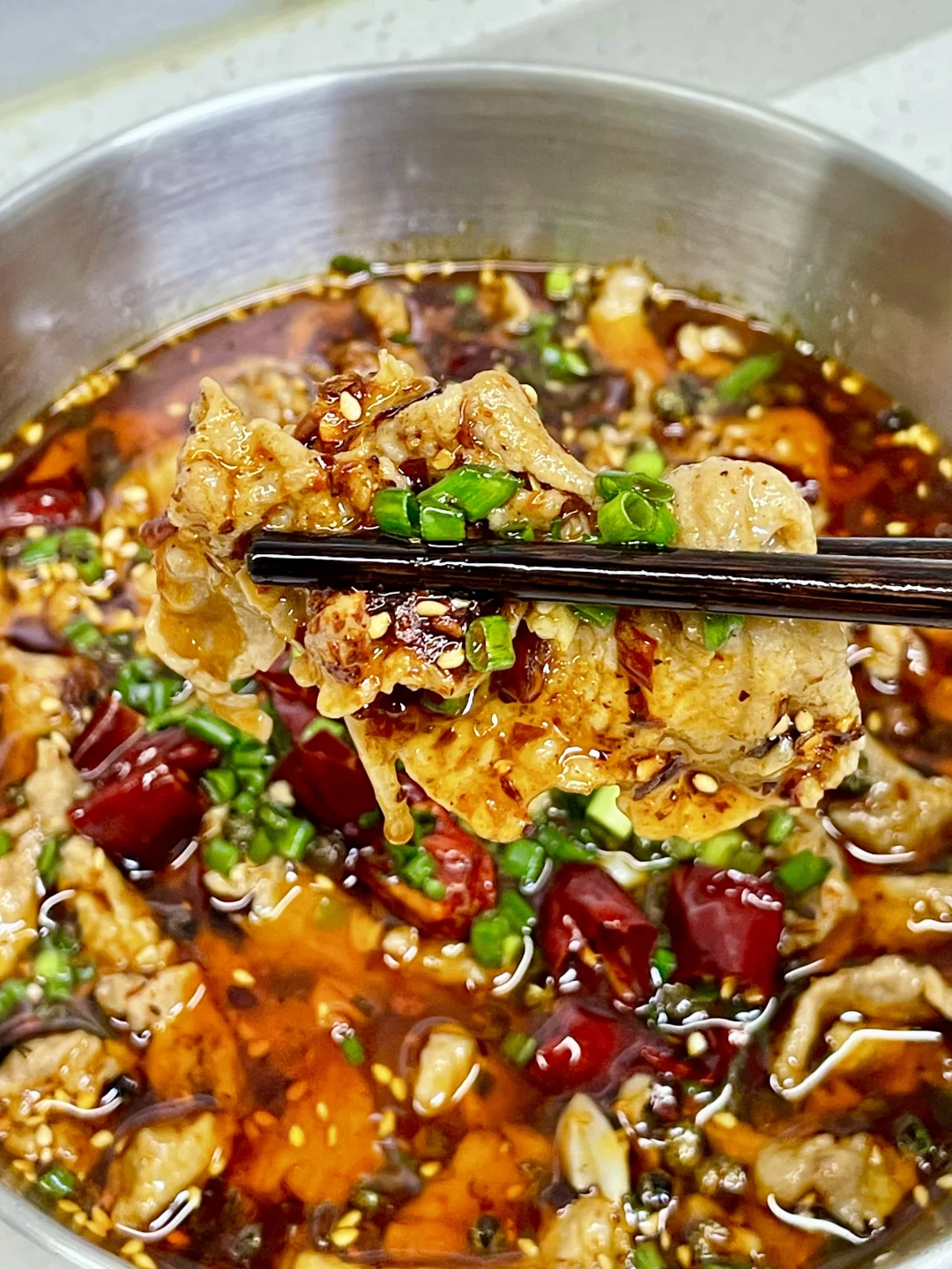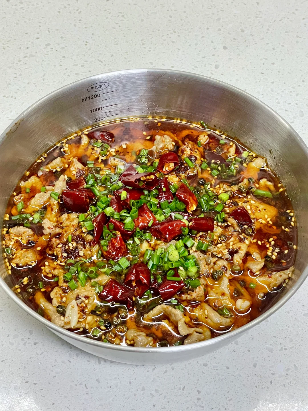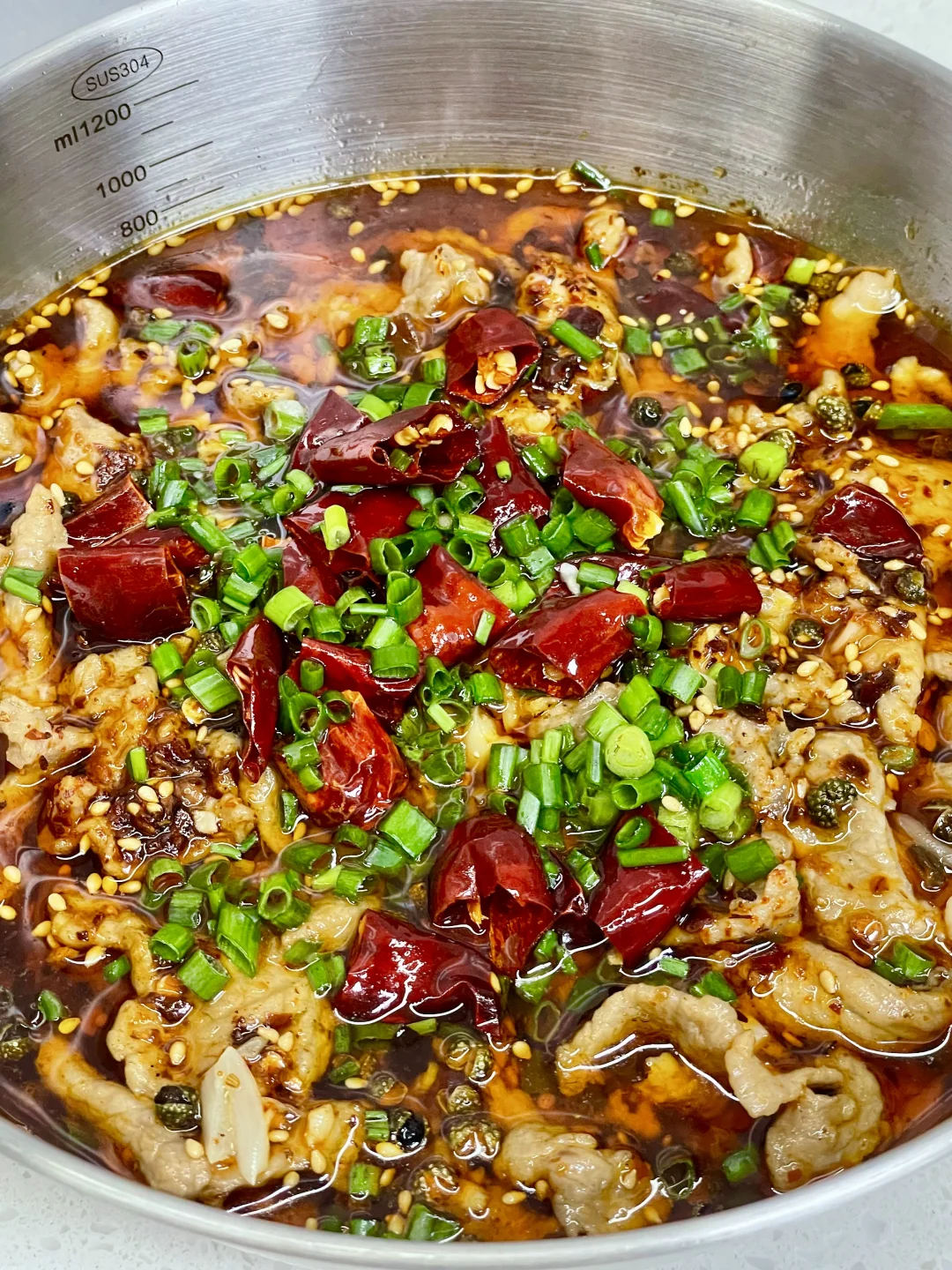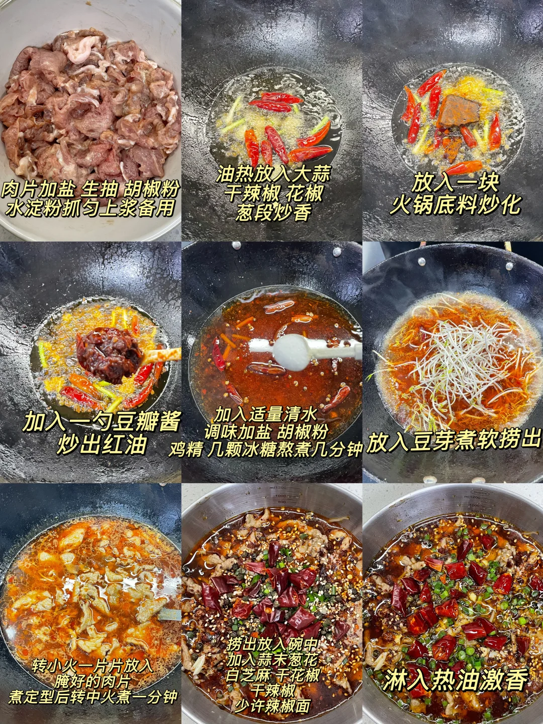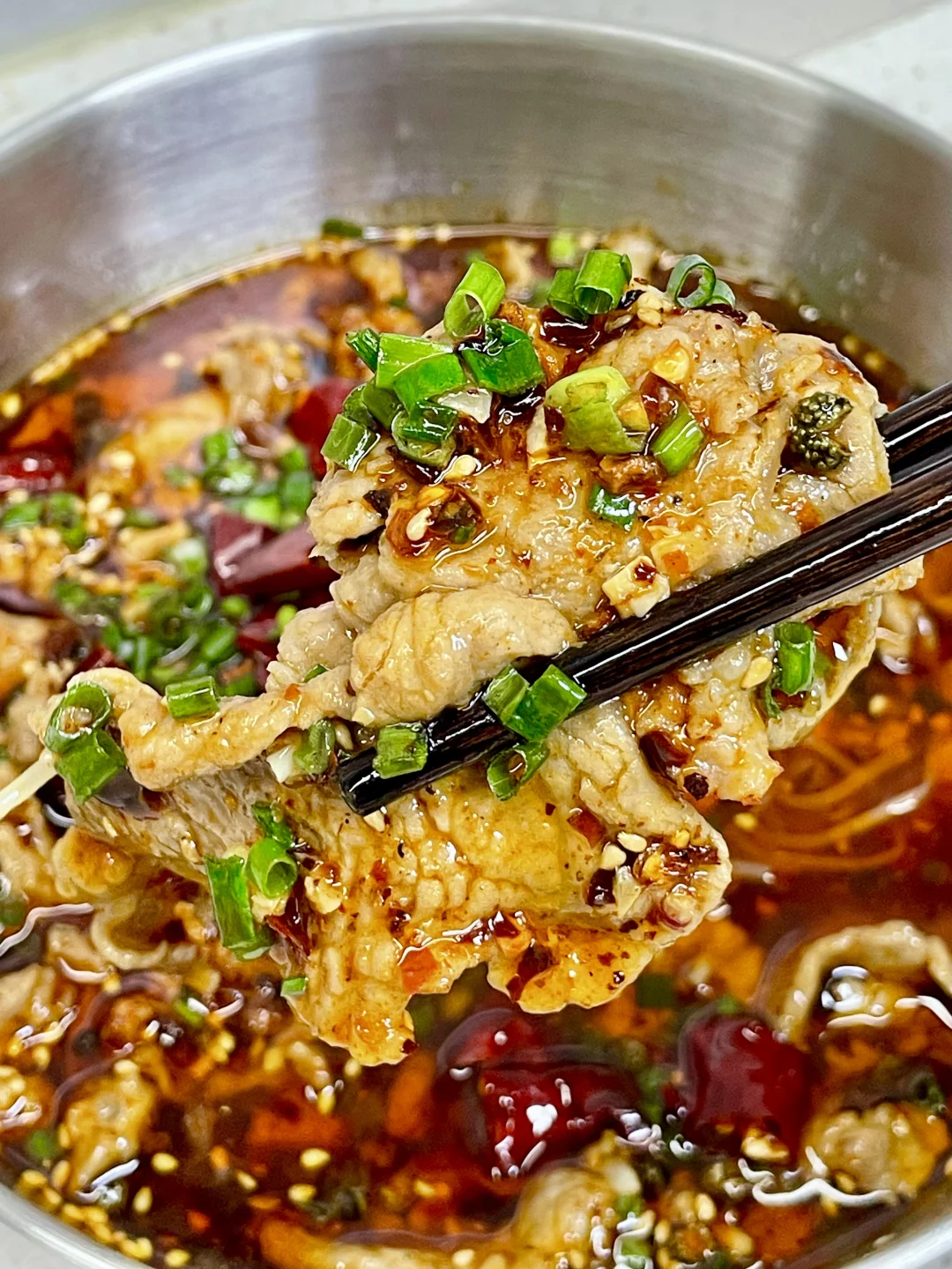 香辣过瘾的水煮肉片,我家最爱吃的下饭菜,每次都喜欢换着配菜来做,搭配什么都好吃😋 1⃣️:瘦肉切薄片(我喜欢用梅花肉或者小里脊),加盐 生抽 胡椒粉,水淀粉(多一点更嫩滑)抓匀备用 2⃣️:锅中油热倒入葱段 大蒜 干花椒 干辣椒炒香,放入一块火锅底料炒化,加一勺豆瓣酱炒出红油,加入适量清水,放入盐 胡椒粉 鸡精 几颗冰糖调味 3⃣️:水开继续熬煮一会儿,放入放入配菜煮熟捞出,转小火一片片放入肉片,煮定型后转中火大约煮一分钟,煮熟捞出放入碗中,再加入原汤,放入葱花 白芝麻 干花椒 辣椒面 少许辣椒段,泼热油即可