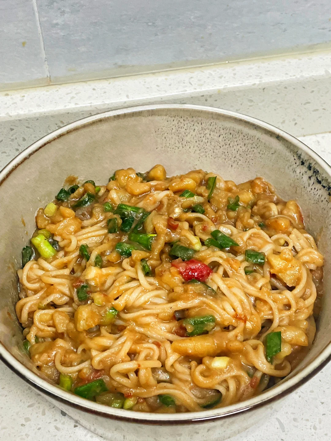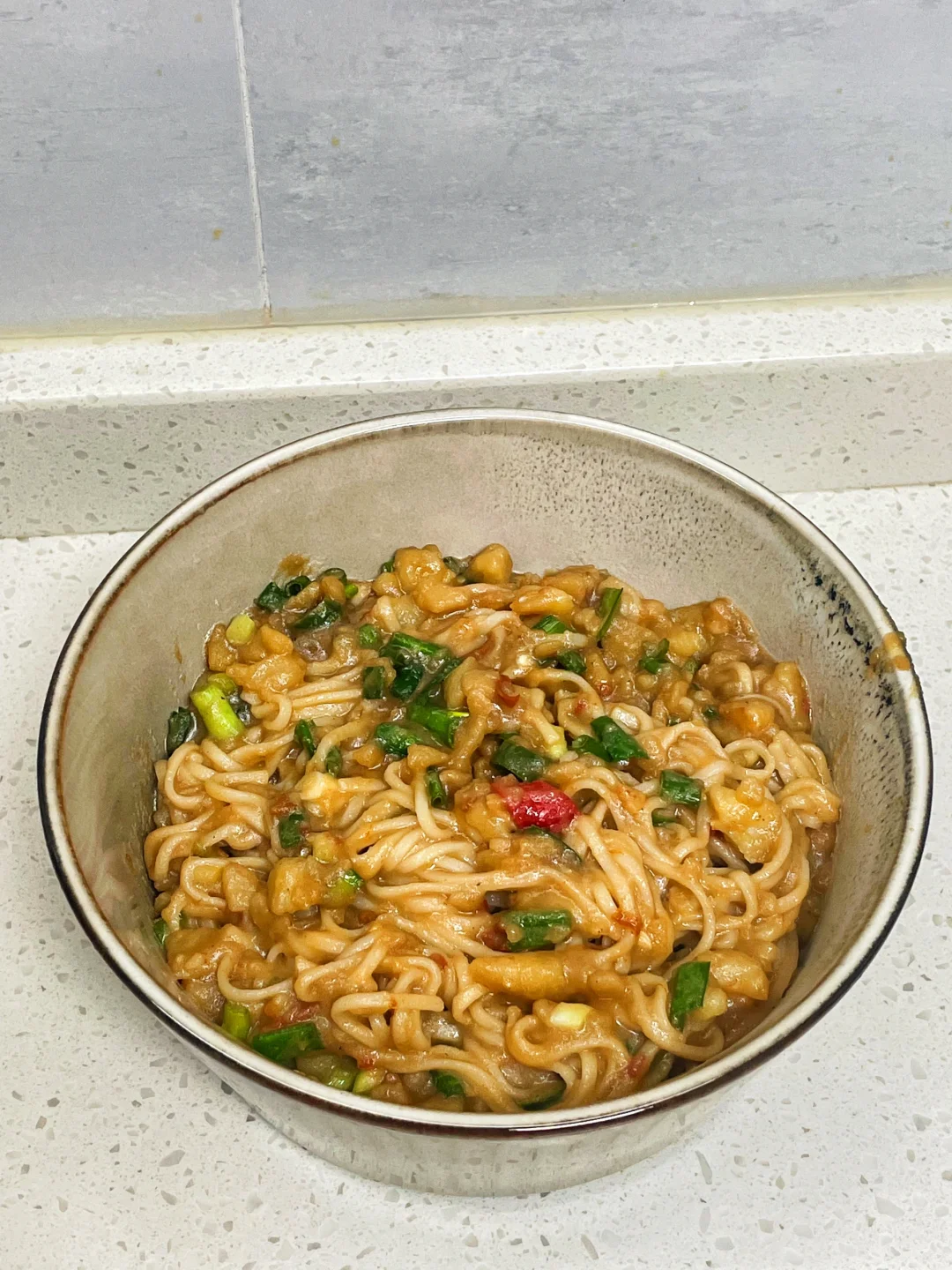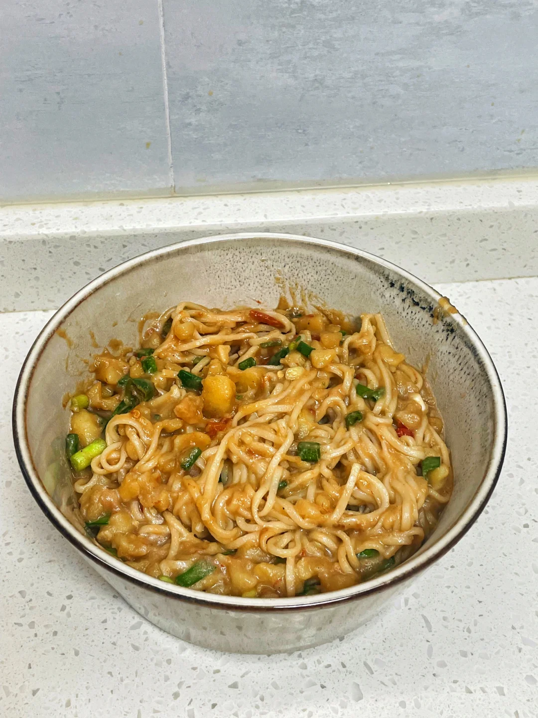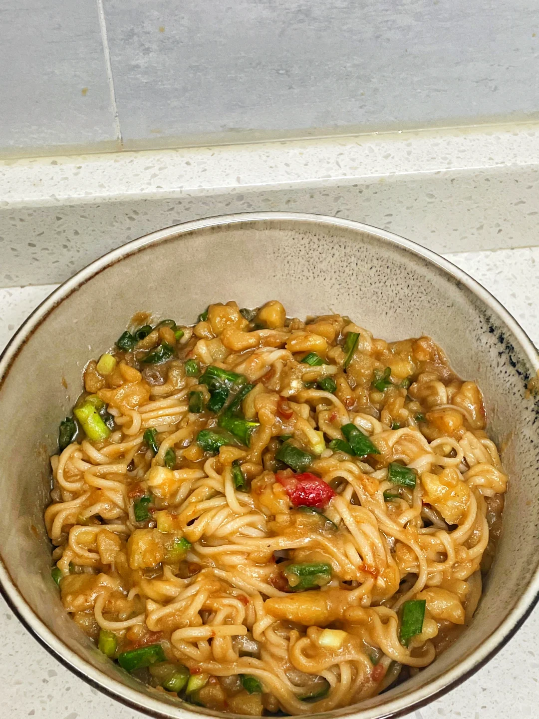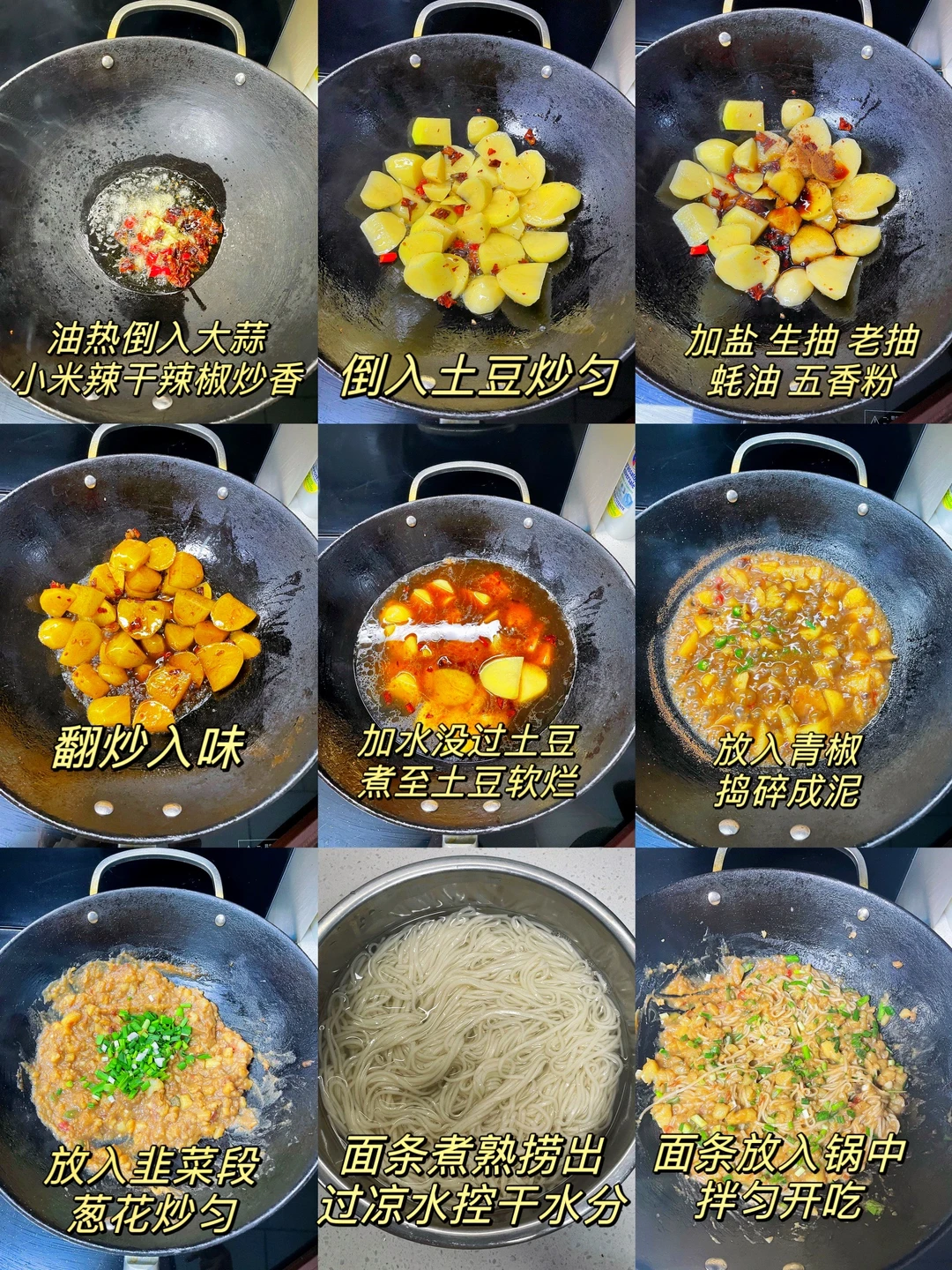 这碗面我真的能吃一辈子,土豆泥拌面yyds,每根面条都包裹着土豆泥,黏黏糊糊,好吃得不得了 1⃣️:土豆切块备用,油热倒入大蒜 小米辣 干辣椒段炒香,倒入土豆炒匀,加盐 生抽 老抽 蚝油 五香粉炒匀,加水没过土豆煮软,放入青椒捣碎成泥,放入韭菜段,青椒拌匀 2⃣️:锅中水开放入面条煮熟,捞出过凉水沥干水分,再将面条放入土豆泥中拌匀即可,原汁原味开吃,重口味的可以根据自己口味加一些调料