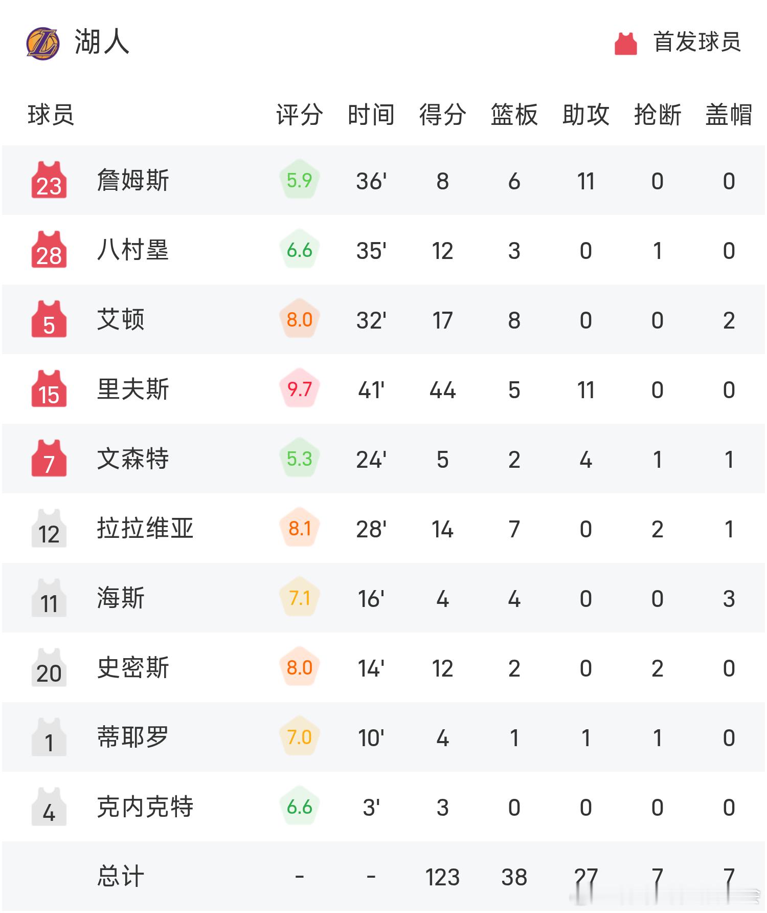 太精彩了,湖人123-120险胜猛龙,这3位球员为赢球立了大功!1.里夫斯