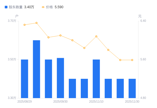 日期A股户数(户)流通A股户均持股数(股)户均持股市值(万元)2025-11-303400025088.7314.022025-11-283400025088.7314.022025-11-203400025088.7314.552025-11-103500024371.9114.822025-10-313400025088.7314.652025-10-203400025088.7315.052025-09-303508024658.9015.042025-09-193500024715.2614.982025-09-103600024028.7315.282025-08-293500024715.2615.62