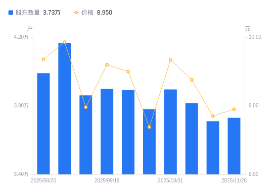 日期A股户数(户)流通A股户均持股数(股)户均持股市值(万元)2025-11-283729811611.0210.392025-11-203710311672.0410.332025-11-103815411350.5210.652025-10-313895811116.2710.752025-10-203780411455.619.952025-09-303892011127.1310.572025-09-193899310581.1910.162025-09-103860810686.709.602025-08-29416779899.769.832025-08-203990210340.1410.01