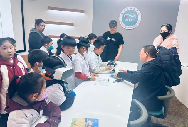 在参观口腔科普馆的环节中,孩子们带着科普馆闯关手册,讲解员的带领下,首先来到了牙齿的模型展示区,通过互动游戏加深了对口腔健康知识的理解。接着,他们进入了舒适体验区,亲身体验了STA无痛麻醉仪等现代化口腔治疗设备带来的舒适感受。在神奇的显微镜前,通过显微镜观察牙齿的微观结构,每一个孩子都惊叹于牙齿的神奇与复杂。最后,VR体验馆更是将活动推向了高潮,孩子们戴上VR眼镜,仿佛置身于一个充满奇幻色彩的口腔世界,享受了一场视觉与知识的盛宴。