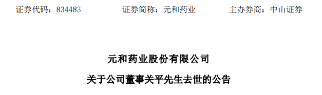 新三板公司元和药业12月2日公告,公司董事关平先生于2025年12月1日因意外不幸去世。