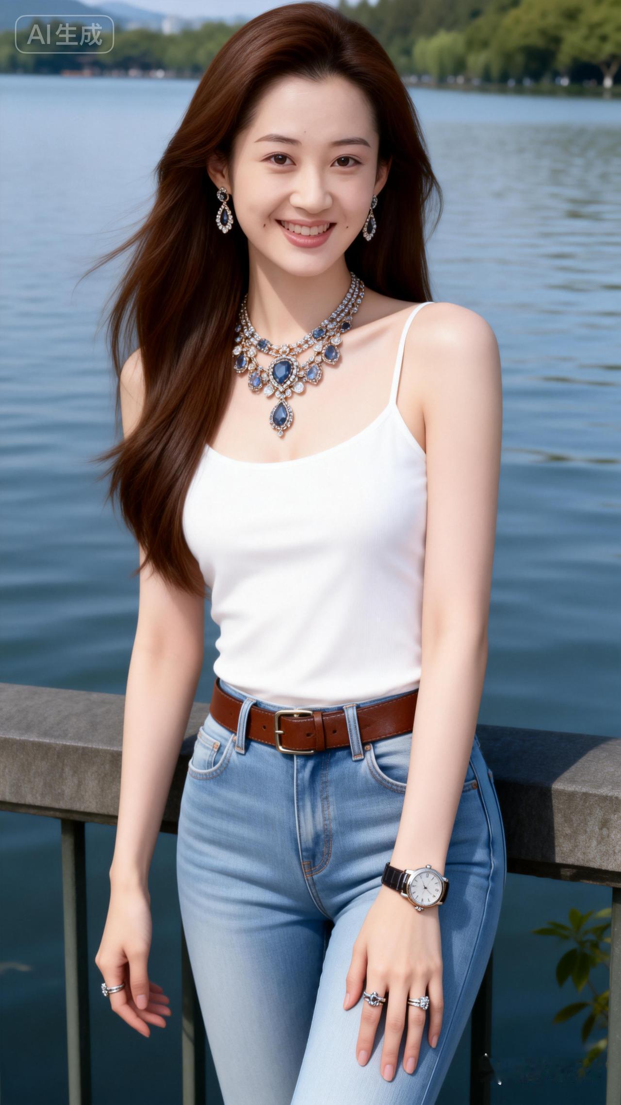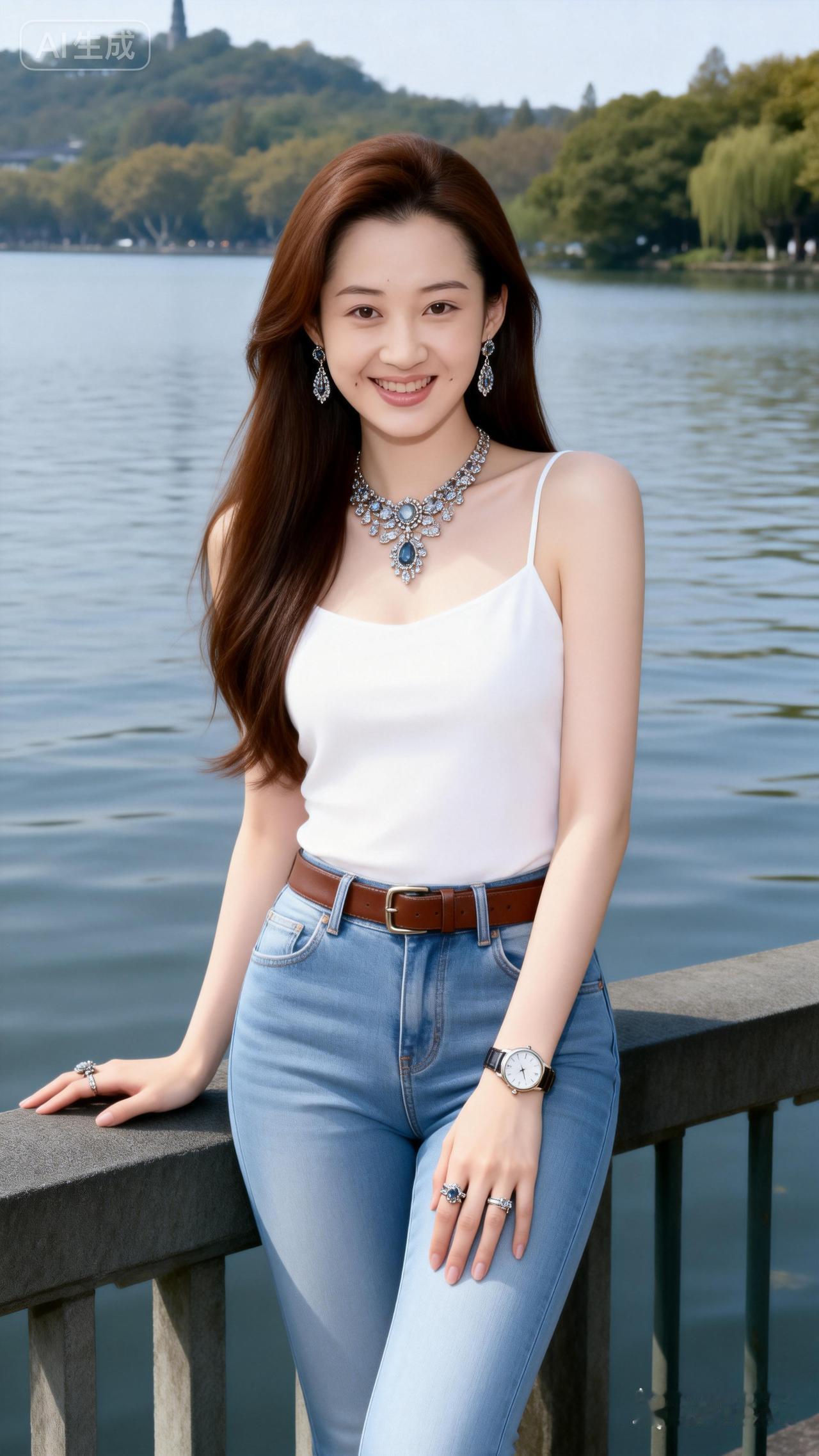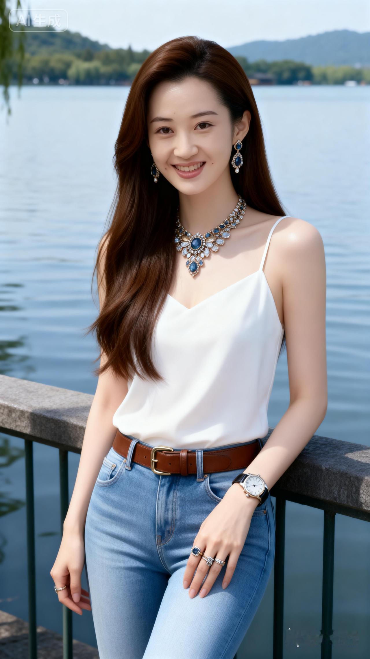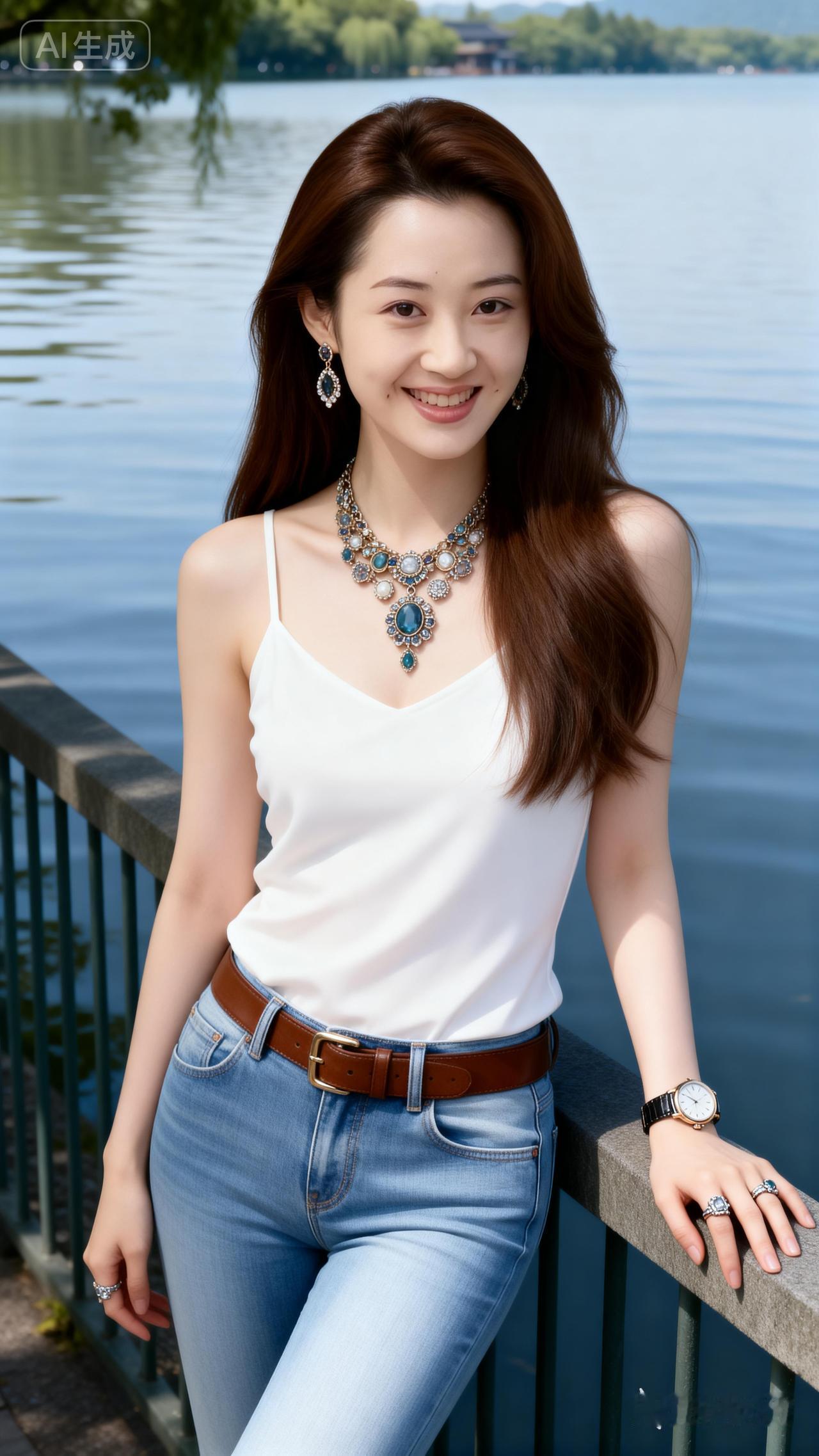 湖畔美人倚栏杆,笑语盈盈映碧波。