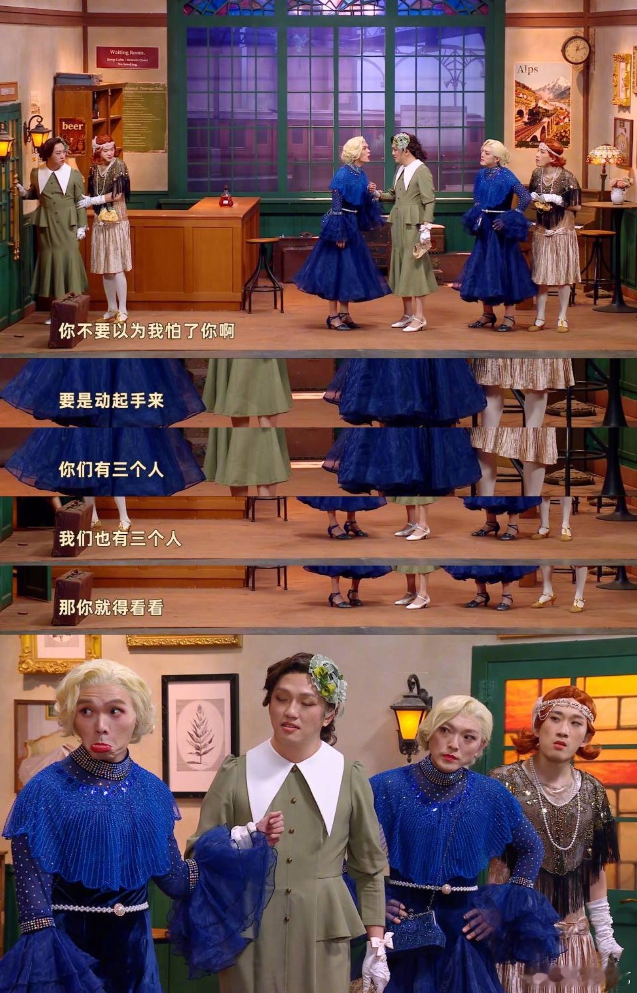 刘同女装笑不活了!《再见噶尔波》里三组人齐cos女歌唱家+伴舞,热门角色撞脸程度堪比复制粘贴~ 一一对上时以为是照镜子的懵圈反应,到后来三组人全卷入的大型混乱现场,全员反串还撞脸撞造型!笑点密集到停不下来😂 喜人奇妙夜