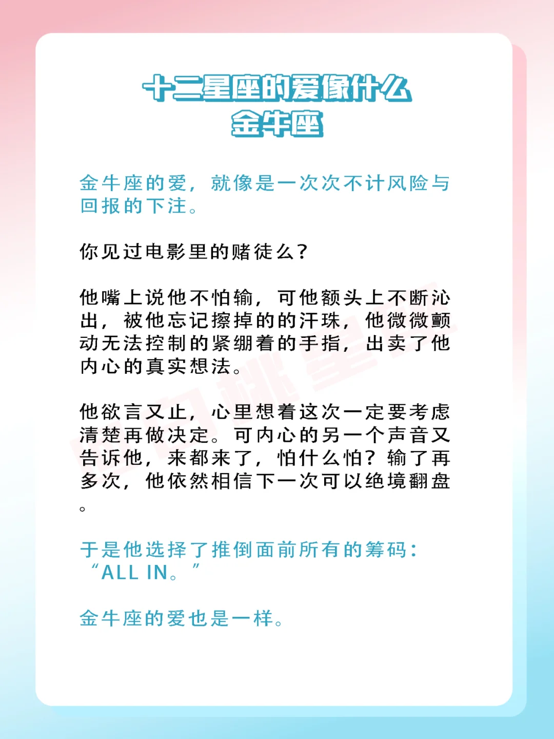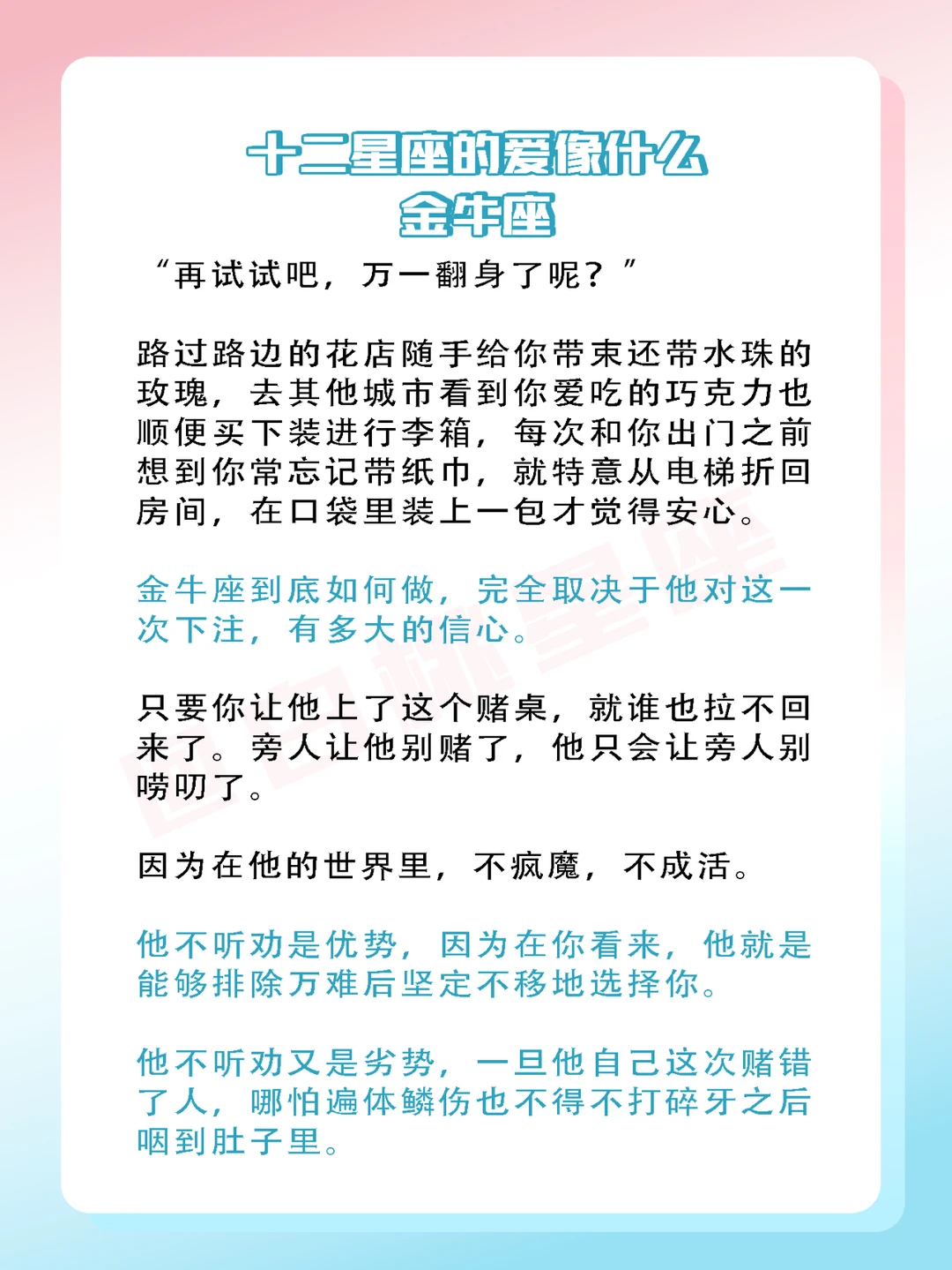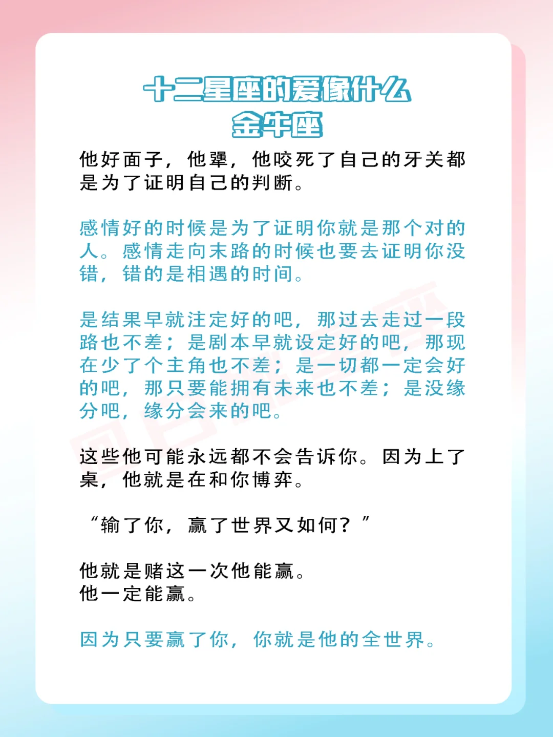 金牛座的爱,就像是一次次不计风险与回报的下注。只要赢了你,你就是他全世界!