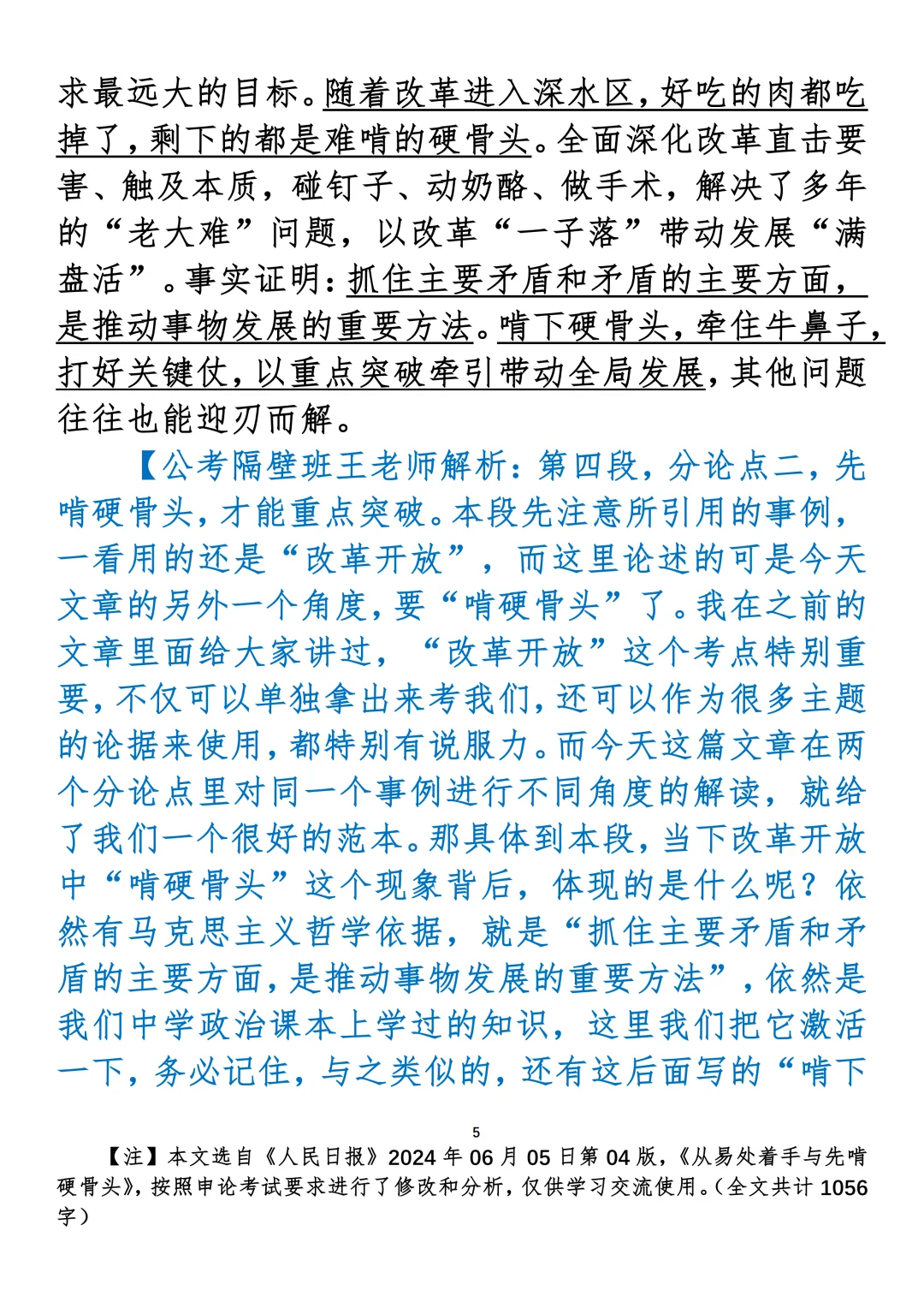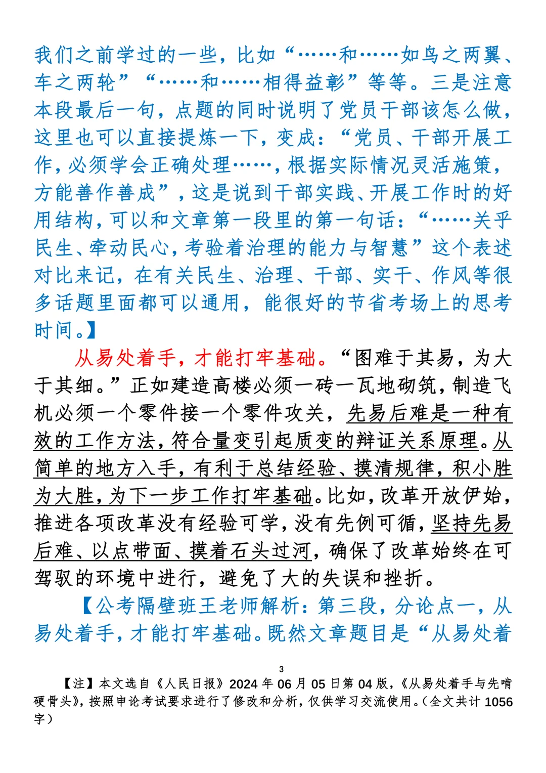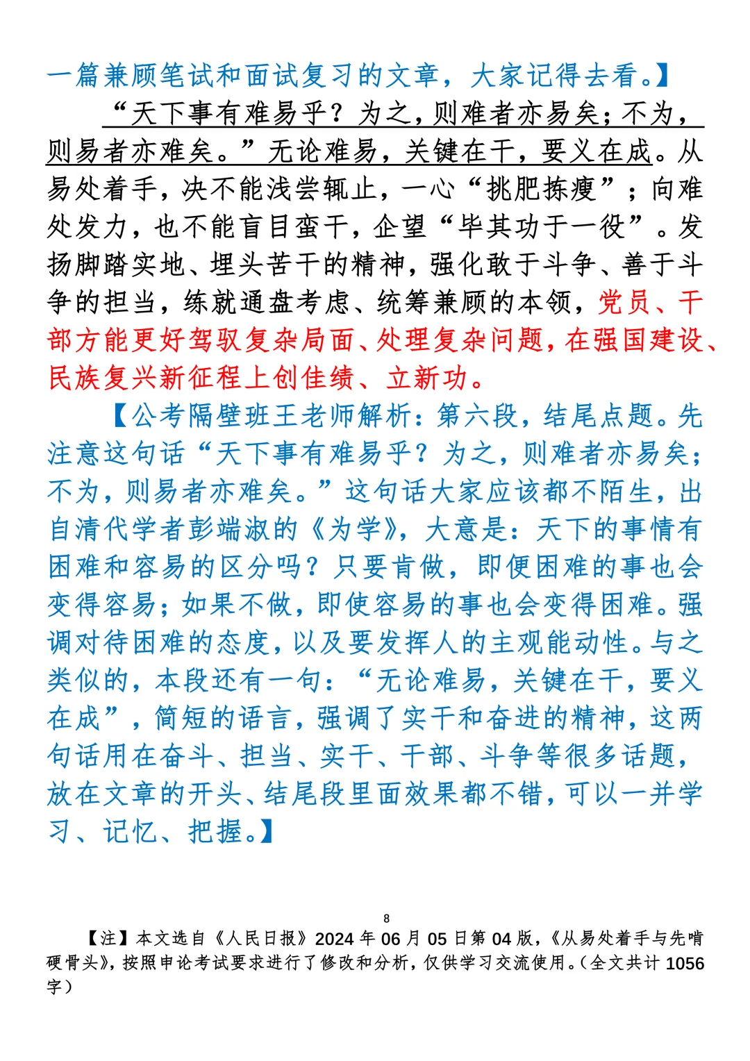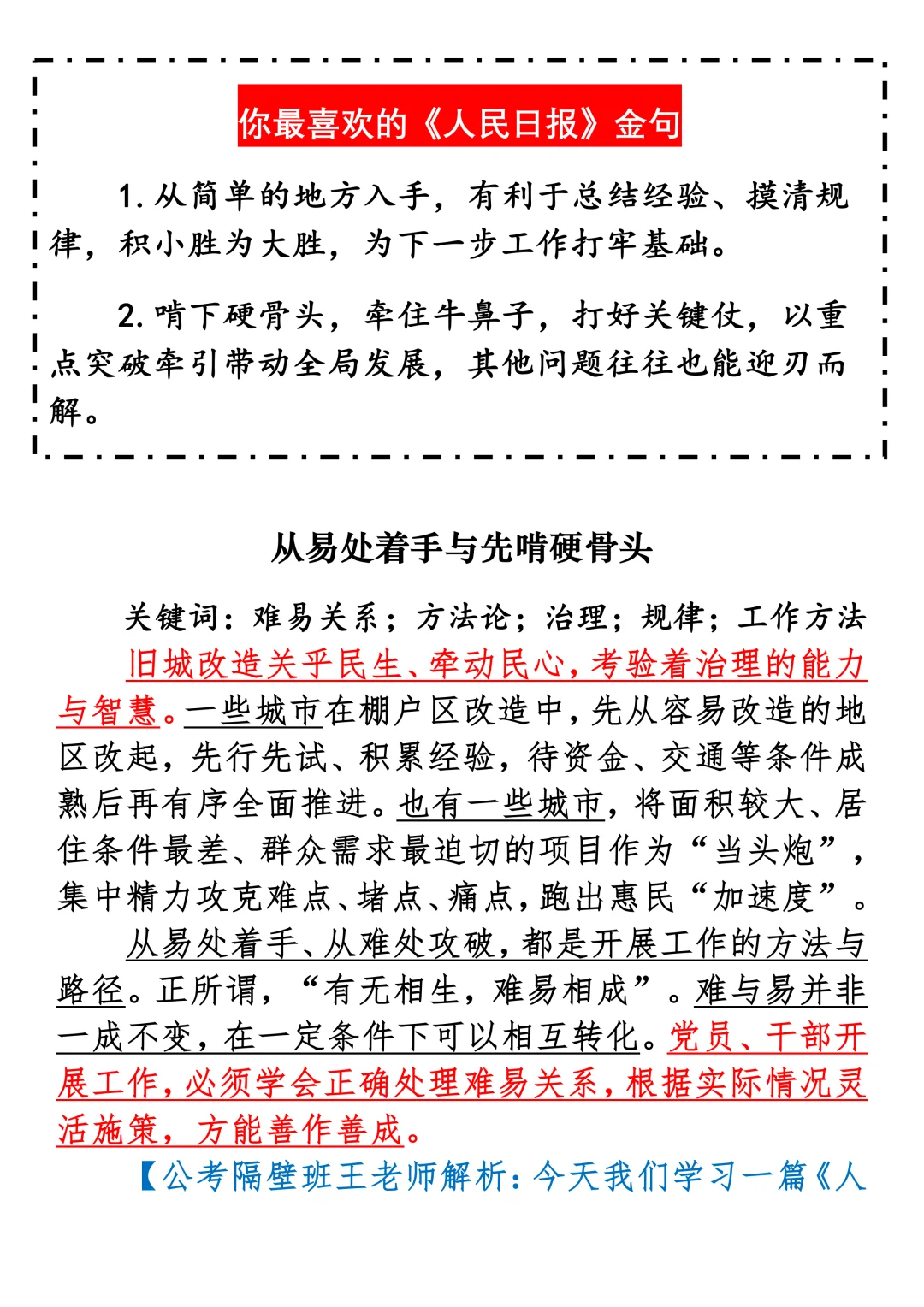 如何抄写:每日抄写文章发在“公考隔壁班王老师”账号,红色字是重点句和结构句,黑色字是正文,蓝色字是解析,大家抄写时不必抄蓝色字。建议先通读全文,做到心中有数再开始抄写,效果会更好。关于文章:抄写文章来源于人民日报,但每篇文章我都根据申论考试要求进行了修改:一是重写或修改开头、结尾;二是统一段首句句式结构;三是调整段落字数,使文章结构更均衡;四是简化复杂长难句,使之更具可模仿性。每篇文章无论修改多少,都是基于申论考试要求,毫无对人民日报文章品评之意。(此处致敬人民日报)