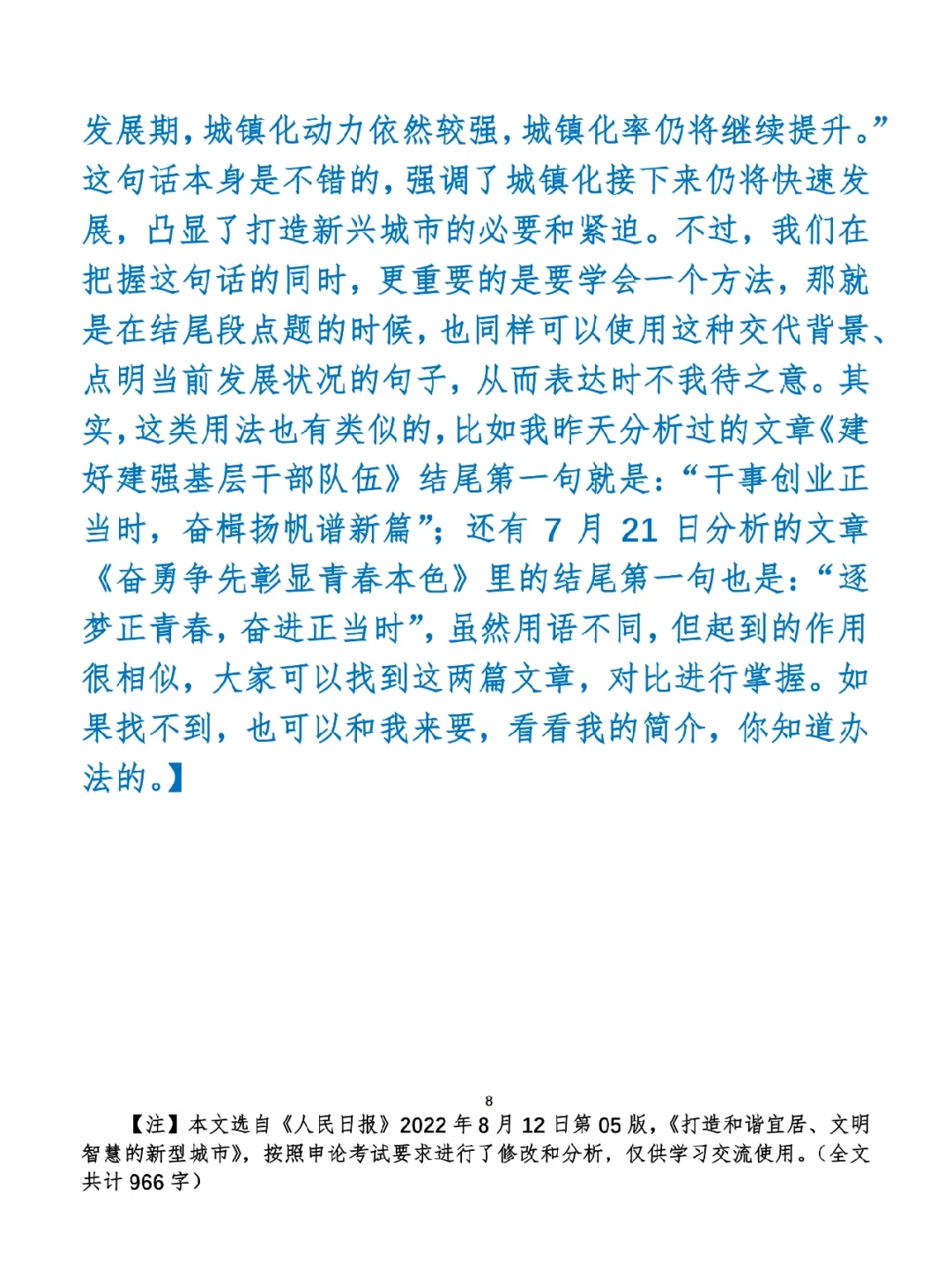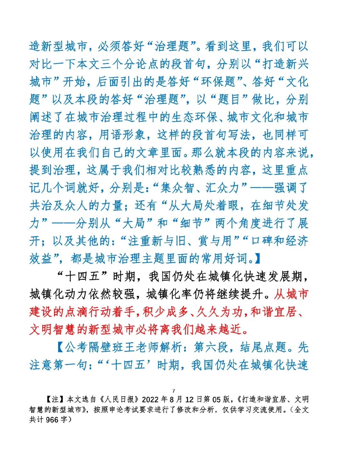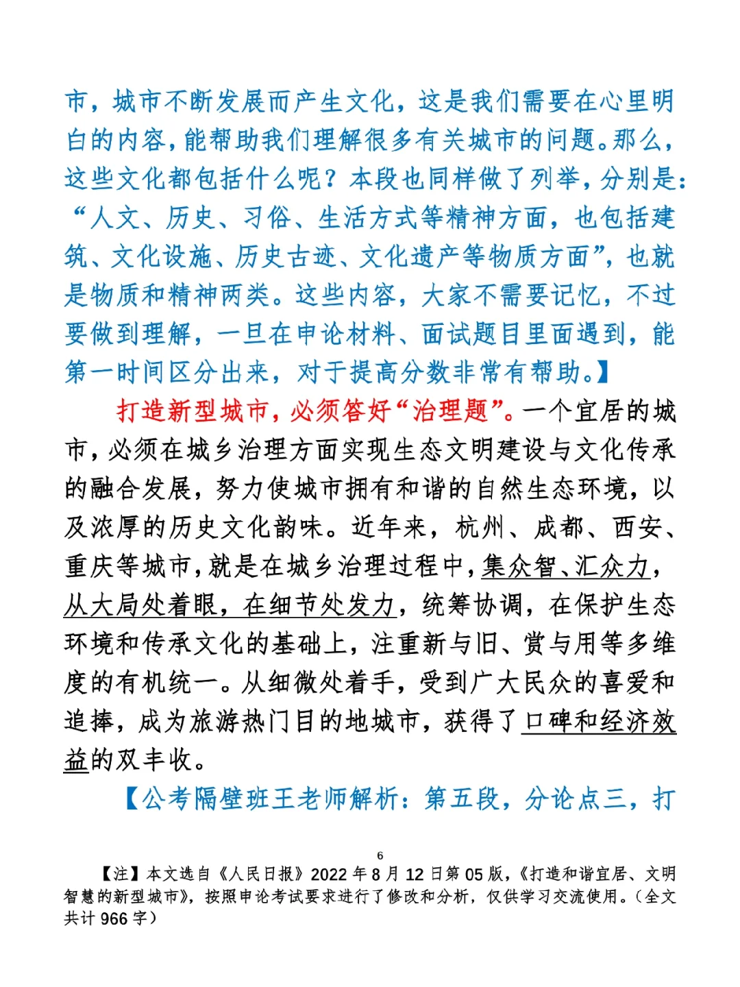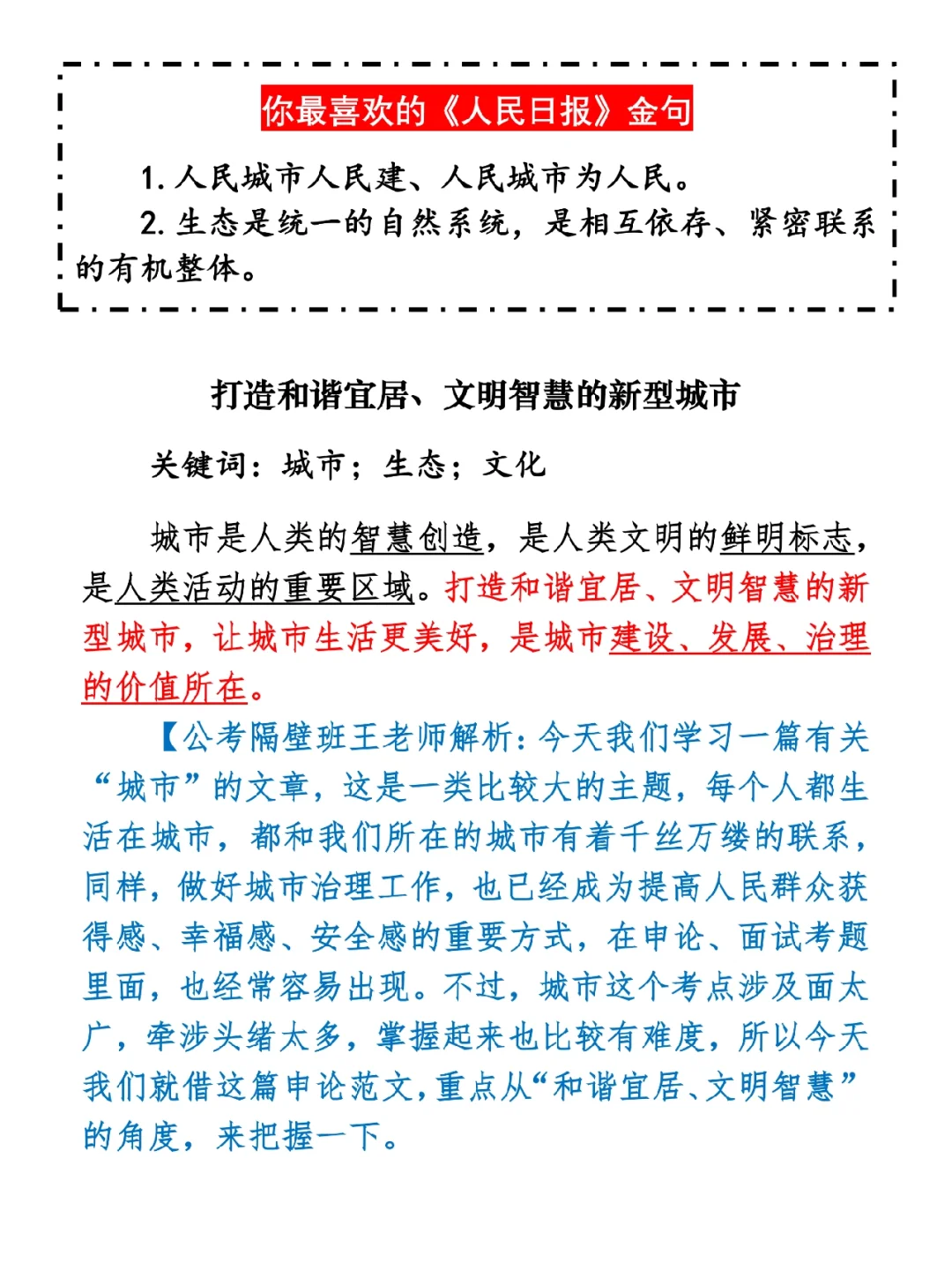 今日打卡作业: 1. 选一句你最喜欢的金句 2. 抄写全文红字+划线部分内容 3. 写完后在留言区打卡 ⭐️ ⭐️ ⭐️ ⭐️ ⭐️ ⭐️ 如何抄写:每天的抄写文章以图片形式发在“公考隔壁班王老师”账号,红色字是重点句和结构句,黑色字是正文,蓝色字是解析,大家抄写时不必抄蓝色字。建议先通读全文(包括蓝色解析部分),做到心中有数再开始抄写,效果会更好。 关于文章:抄写文章来源于人民日报,但每篇文章我都根据申论考试要求进行了修改,主要集中在四个方面:一是重写或修改开头、结尾;二是统一段首句句式结构;三是调整段落字数,使文章结构更均衡;四是简化复杂长难句,使之更具可模仿性。每篇文章修改幅度不同,无论修改多少,都是基于申论考试要求,毫无对人民日报文章品评之意。(此处致敬人民日报) 关于解析:我会在文章每段后面加一段蓝色字的解析,是我自己在抄写时的感悟,篇幅时间有限,不能面面俱到,但求重点突出。如果你有其他感悟,也希望能在评论里分享,我们相互学习、共同进步。 ⭐️ ⭐️ ⭐️ ⭐️ ⭐️ ⭐️ 这里是公考隔壁班王老师独创的“每天半小时・申论80分”抄写团,欢迎加入我们!