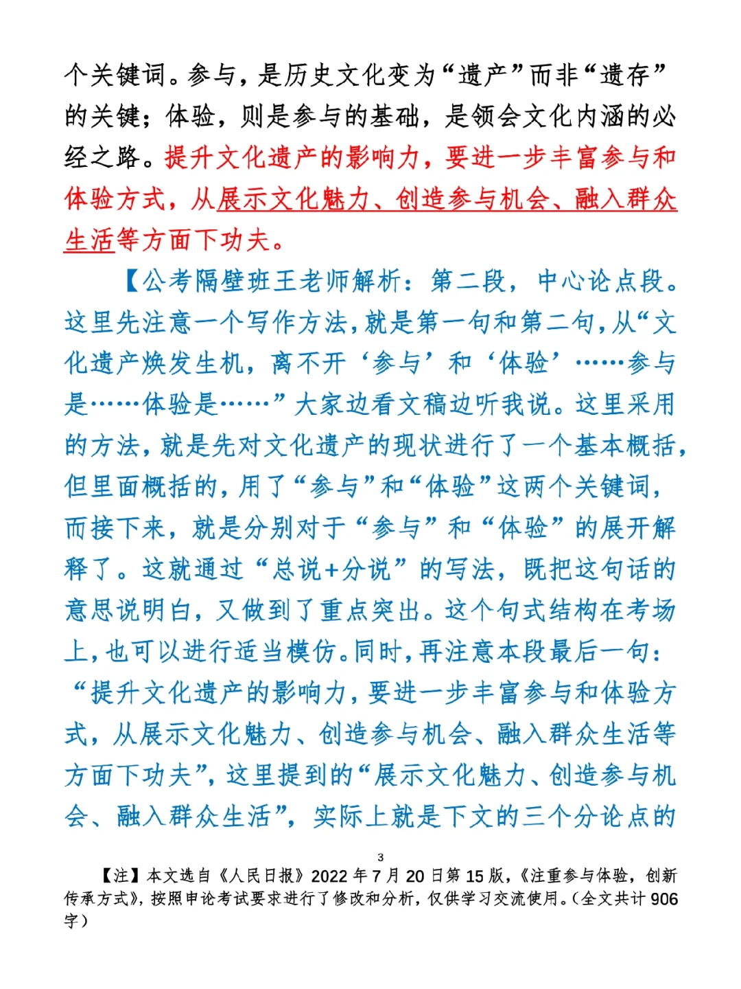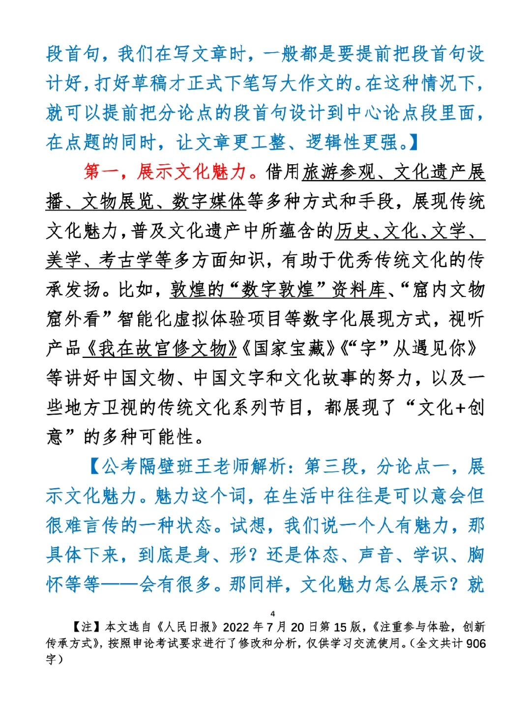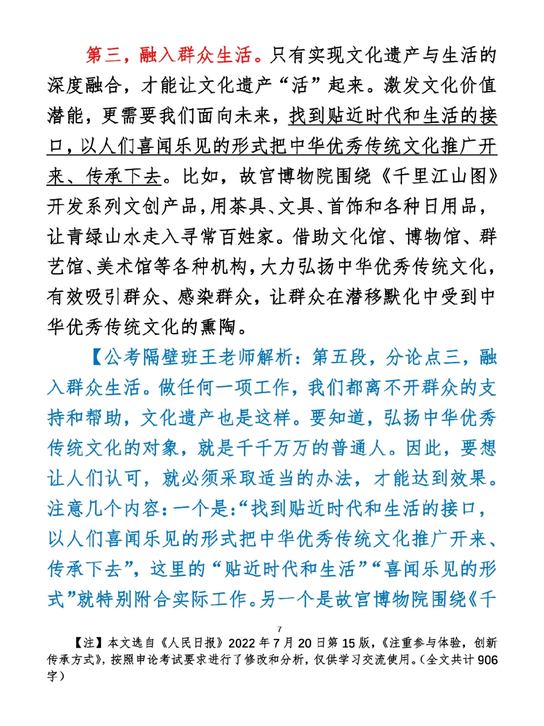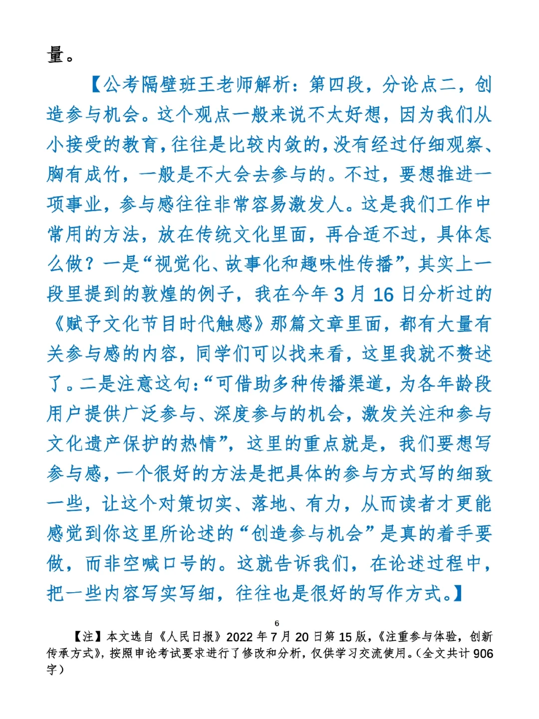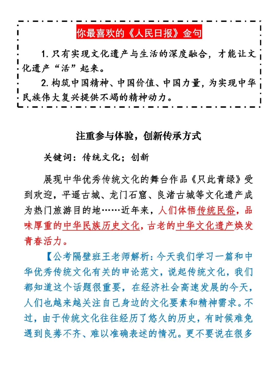 今日打卡作业: 1. 选一句你最喜欢的金句 2. 抄写全文红字+划线部分内容 3. 写完后在留言区打卡 ⭐️ ⭐️ ⭐️ ⭐️ ⭐️ ⭐️ 如何抄写:每天的抄写文章以图片形式发在“公考隔壁班王老师”账号,红色字是重点句和结构句,黑色字是正文,蓝色字是解析,大家抄写时不必抄蓝色字。建议先通读全文(包括蓝色解析部分),做到心中有数再开始抄写,效果会更好。 关于文章:抄写文章来源于人民日报,但每篇文章我都根据申论考试要求进行了修改,主要集中在四个方面:一是重写或修改开头、结尾;二是统一段首句句式结构;三是调整段落字数,使文章结构更均衡;四是简化复杂长难句,使之更具可模仿性。每篇文章修改幅度不同,无论修改多少,都是基于申论考试要求,毫无对人民日报文章品评之意。(此处致敬人民日报) 关于解析:我会在文章每段后面加一段蓝色字的解析,是我自己在抄写时的感悟,篇幅时间有限,不能面面俱到,但求重点突出。如果你有其他感悟,也希望能在评论里分享,我们相互学习、共同进步。 ⭐️ ⭐️ ⭐️ ⭐️ ⭐️ ⭐️ 这里是公考隔壁班王老师独创的“每天半小时・申论80分”抄写团,欢迎加入我们!