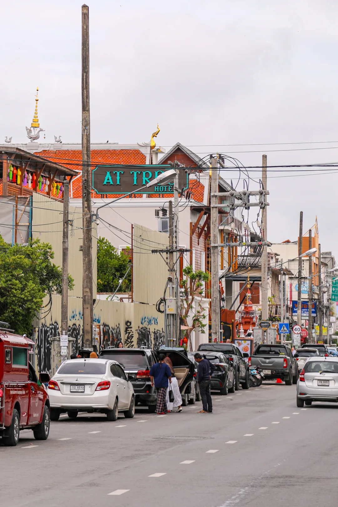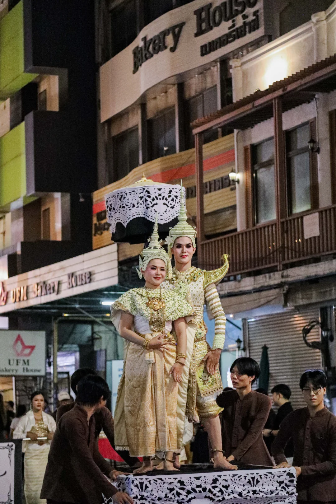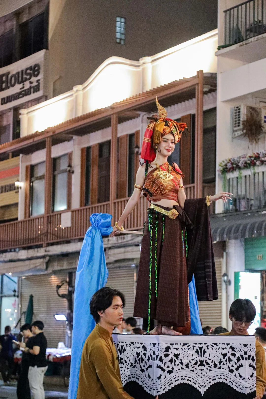偶遇水灯节,晚上的古城真的美到失语!傍晚6点从塔佩门出发,沿Ratchadamnoen路走到帕辛寺,沿途全是惊喜。身着兰纳传统服饰的巡游队伍缓缓走来,女子裙摆银饰叮当作响,男子敲击长鼓节奏轻快,小朋友涂着金粉超可爱🥰 路边手工艺人推着花车卖纸灯,烛光透过镂空花纹超梦幻,还能收到当地人递来的茉莉花环,路过寺庙时僧人会点眉心朱砂,仪式感拉满。