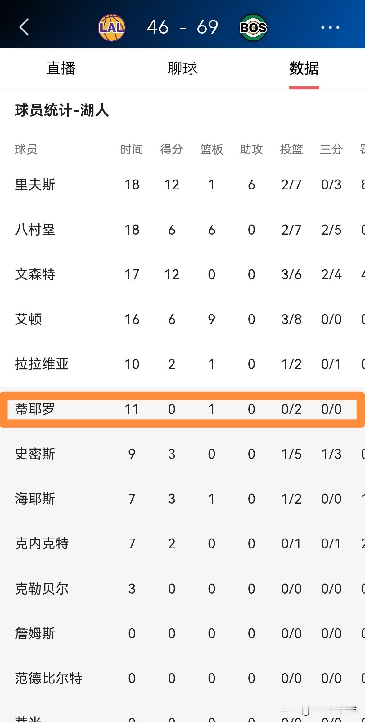 湖人新秀蒂耶罗真是难成大器!在今天湖人客场挑战凯尔特人的比赛中,目前双方半场战罢,湖人以46:69落后于对手。在前两节比赛中,蒂耶罗替补出战11分钟,投篮2中0怒砍0分,出现了3次犯规。 虽然蒂耶罗的身体素质非常出色,但是他不擅长投篮,这让他很难进入到湖人的常规轮换阵容中,我觉得蒂耶罗的培养价值并不高。