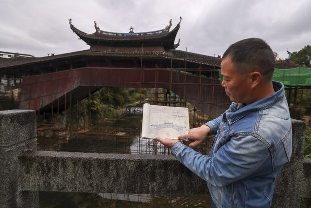 木拱桥传统营造技艺省级代表性传承人曾家快在修缮中的泰顺县泗溪镇溪东桥前展示自己绘制的溪东桥结构图(资料照片)。新华社记者江汉摄