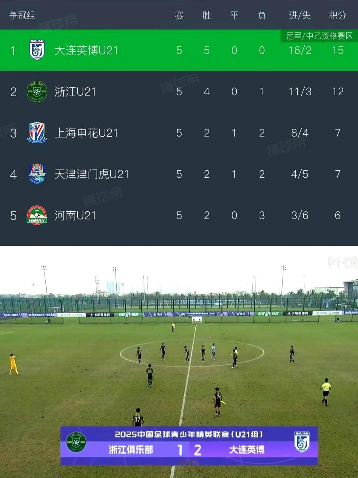 大连足球的青训,两年就见效了? 真不是吹,大连英博这操作有点东西。在最近的U21青年联赛中,他们表现出色,取得了优异成绩,同时B队也基本锁定了中乙的升级附加赛资格,眼看就要冲甲了。这帮小年轻踢得风生水起,攻防转换那叫一个快。 想当年,就在2021年,他们一线队还在中乙混日子,冲甲失败。那时候谁能想到,两年后梯队能搞出这么大动静。看来当时俱乐部决定狠抓青训,是真走对路了。 他们这套路子很实在,2022年请来前国脚当青训总监,从U13到U21的梯队全都建齐了。直接把欧洲那套训练模式搬过来用,球员水平能不涨吗。效果简直了。 球员数据也摆在这。B队有个中场,贡献了多个进球和助攻,成为球队关键球员。U21那边更猛,锋线小将进球表现出色,名列前茅,听说中超球队都来打听了。 这青训底子打扎实了,以后一线队不愁没人用,冲超的底气也足了。