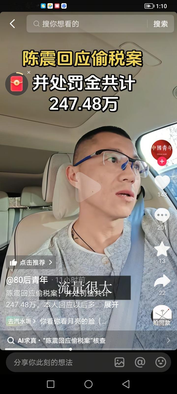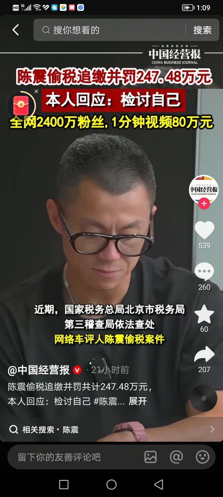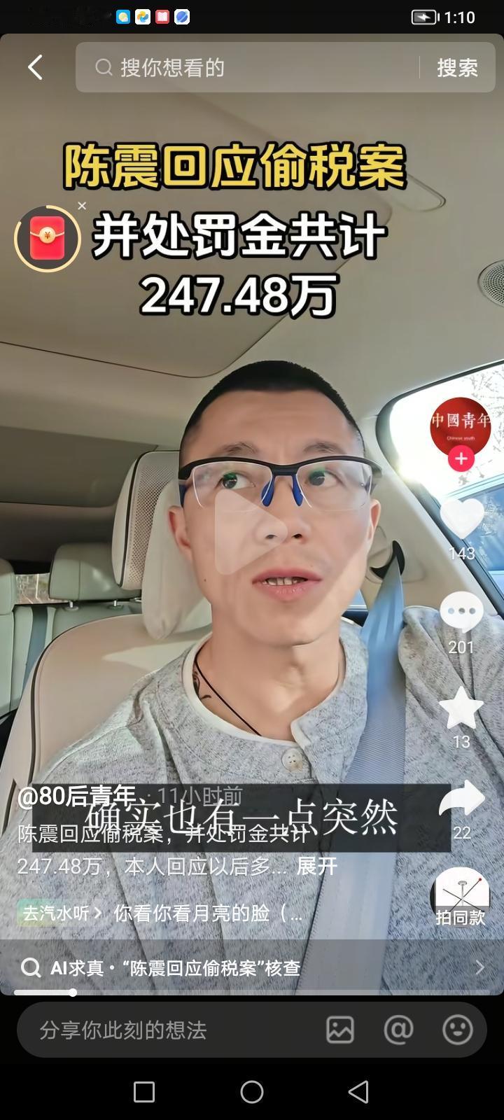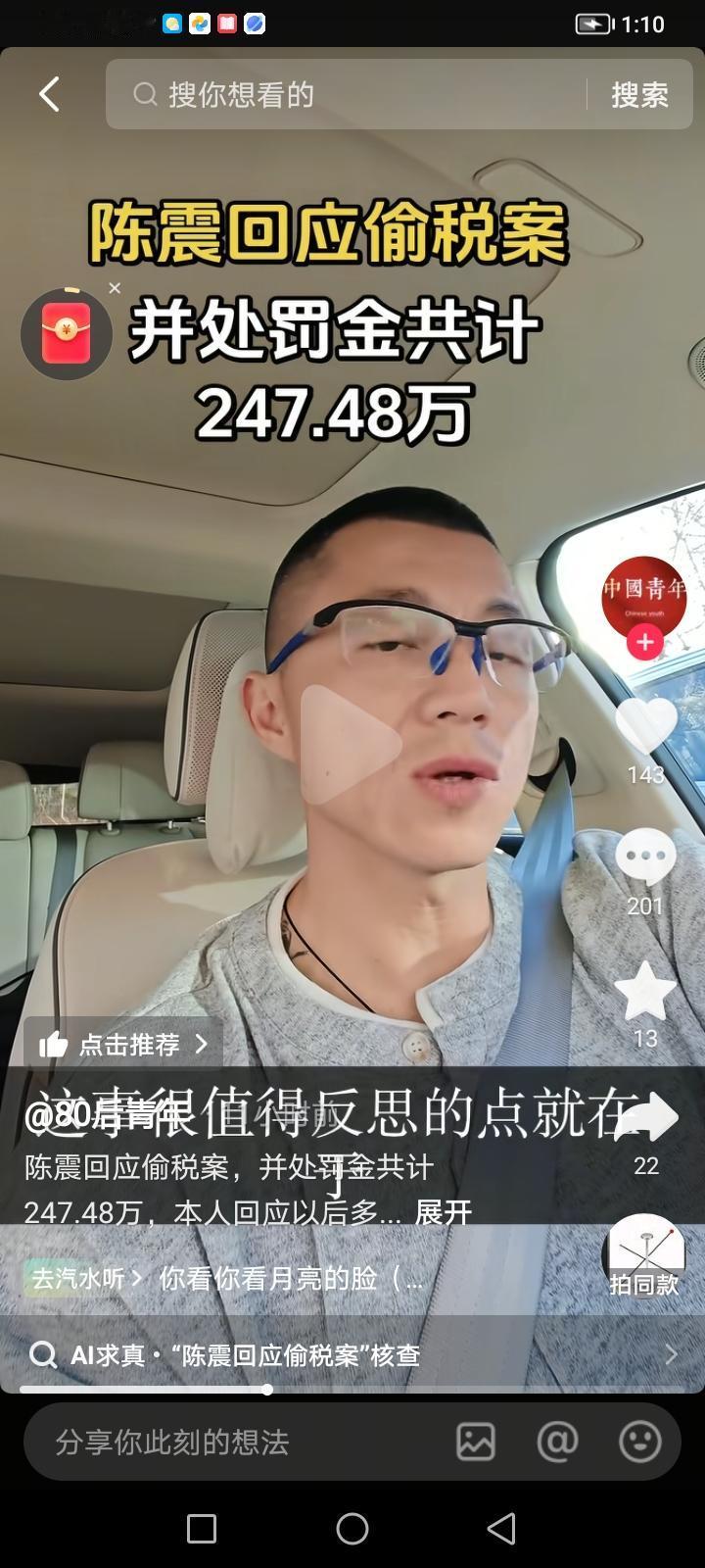 早上看到车评人陈震回应偷税漏税的视频,我都想笑,视频他居然说自己有点意外,而且还说什么是流量大,言论不当,最后还说后台有人私信安慰他,我想这偷税漏税还真的会有人安慰他吗?许多人还真被他的这番言论给带偏了,以为他是言论不当被封号的。2021-2023年 :陈震通过少报收入、转换收入性质等方式少缴个人所得税共计118.67万元,其中2021至2022年初通过第三方支付平台提取157.25万元广告劳务报酬未申报纳税,2022年4月起又将230万元个人收入通过空壳工作室虚假申报为生产经营收入。 2. 2025年11月 :国家税务总局北京市税务局第三稽查局对陈震作出追缴税款、加收滞纳金并处罚款共计247.48万元的处理处罚决定,涉案款项已全部追缴入库。 3. 2025年12月5日凌晨:陈震的抖音、微博、B站等多平台账号相继被禁言或封禁。(图片信息来源:80后青年,中国经营报)陈震车评 偷税漏税 车评人 车评人陈震多平台被禁言 车评人陈震多平台账号被禁言