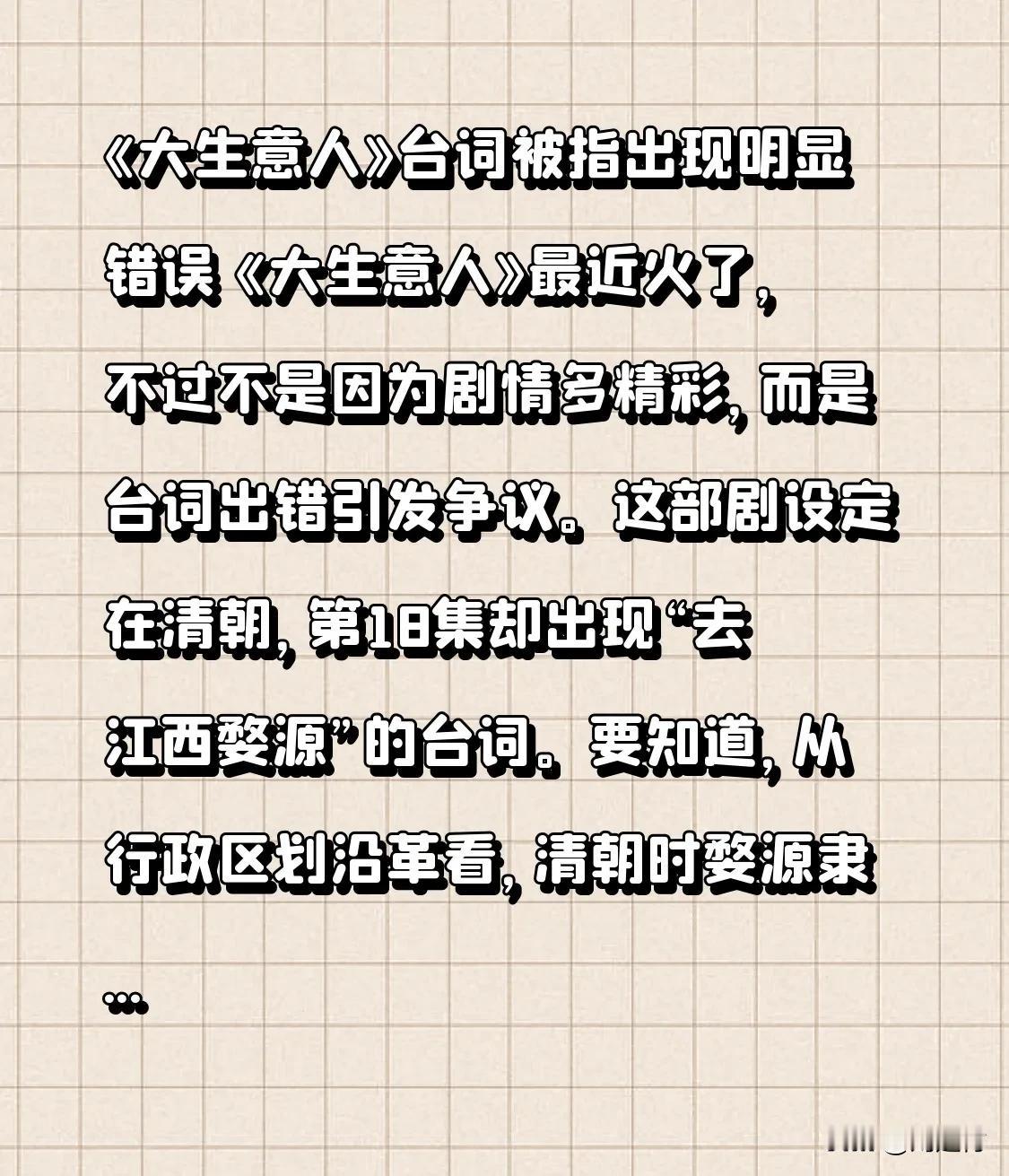 《大生意人》台词被指出现明显错误 《大生意人》台词被指出现明显错误 《大生意人》最近火了 并非剧情精彩 而是台词出错引争议 此剧设定在清朝 第18集却现“去江西婺源”台词 须知从行政区划沿革看 清朝时婺源隶属安徽省徽州府 好多网友发帖指出问题 认为“江西婺源”表述不严谨 违背历史事实 该剧由张挺编剧、执导 陈晓、孙千主演 讲述清末少年古平原传奇经商路 这么一部古装剧 出现历史常识错误 实在不应该 希望后续制作多留意 别再闹此等笑话 大生意人 大生意人剧 大生意人观后感 中国式商人 生意人语录