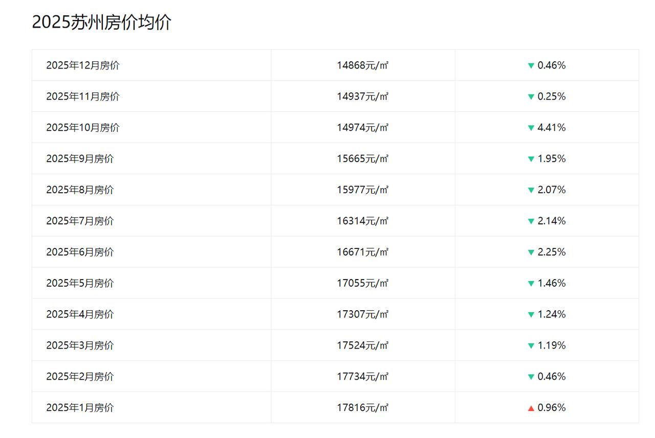 2025年1月,苏州房价均价17816元; 2025年2月,苏州房价均价17734元; 2025年3月,苏州房价均价17524元; 2025年4月,苏州房价均价17307元; 2025年5月,苏州房价均价17055元; 2025年6月,苏州房价均价16671元; 2025年7月,苏州房价均价16314元; 2025年8月,苏州房价均价15977元; 2025年9月,苏州房价均价15665元; 2025年10月,苏州房价均价14974元; 2025年11月,苏州房价均价14937元。 2025年,苏州的房价呈现下降趋势,从1月份的17816元到11月份的14937元,下降了约3000元,相比2021年的22254元,更是下降了约8000元,从今年的数据来看,苏州的房价还在挤泡沫。 苏州房价的底到底在哪里,其实是很难预测的,但是当房价的涨幅稳定在一定的区间的时候,也许就是苏州房价的底。 未来,江苏的房价一定是和经济和人口的波动相关联,2025年前三季度,苏州的GDP增幅5.5%,2024年,苏州的常住人口增长1.1%,达到1298.7万人。 那么,未来,苏州的房价在哪个区间比较合理,大家评论区聊一聊。