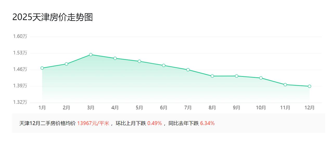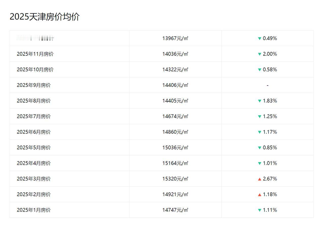 2025年1月,天津房价均价14747元; 2025年2月,天津房价均价14921元; 2025年3月,天津房价均价15320元; 2025年4月,天津房价均价15164元; 2025年5月,天津房价均价15036元; 2025年6月,天津房价均价14860元; 2025年7月,天津房价均价14674元; 2025年8月,天津房价均价14405元; 2025年9月,天津房价均价14406元; 2025年10月,天津房价均价14322元; 2025年11月,天津房价均价14036元。   2025年1-11月份,天津的房价小幅震荡,但是基本维持在1.4万左右,并且在3-5月份,房价还一度涨到1.5万,这个房价水平,已经回归到2015年的水平,结合天津的历史房价数据和2025年数据,可以发现天津的房价基本上是到了低位了。   当然,未来天津的房价长期会随着经济的波动而波动,但是这个波动一定是建立在合理的涨幅范围内的,不会再出现前几年的大涨大跌的情况。2025年前三季度,天津的GDP增速为4.7%,不仅低于上海、北京,还远低于苏州、杭州、广州、南京、深圳。2024年末天津市常住人口总量1364万人,2024年天津人口自然增长率为-1.97‰。   如果按照以上数据,大家觉得天津未来的房价会在哪个区间比较合理呢?评论区聊一聊。
