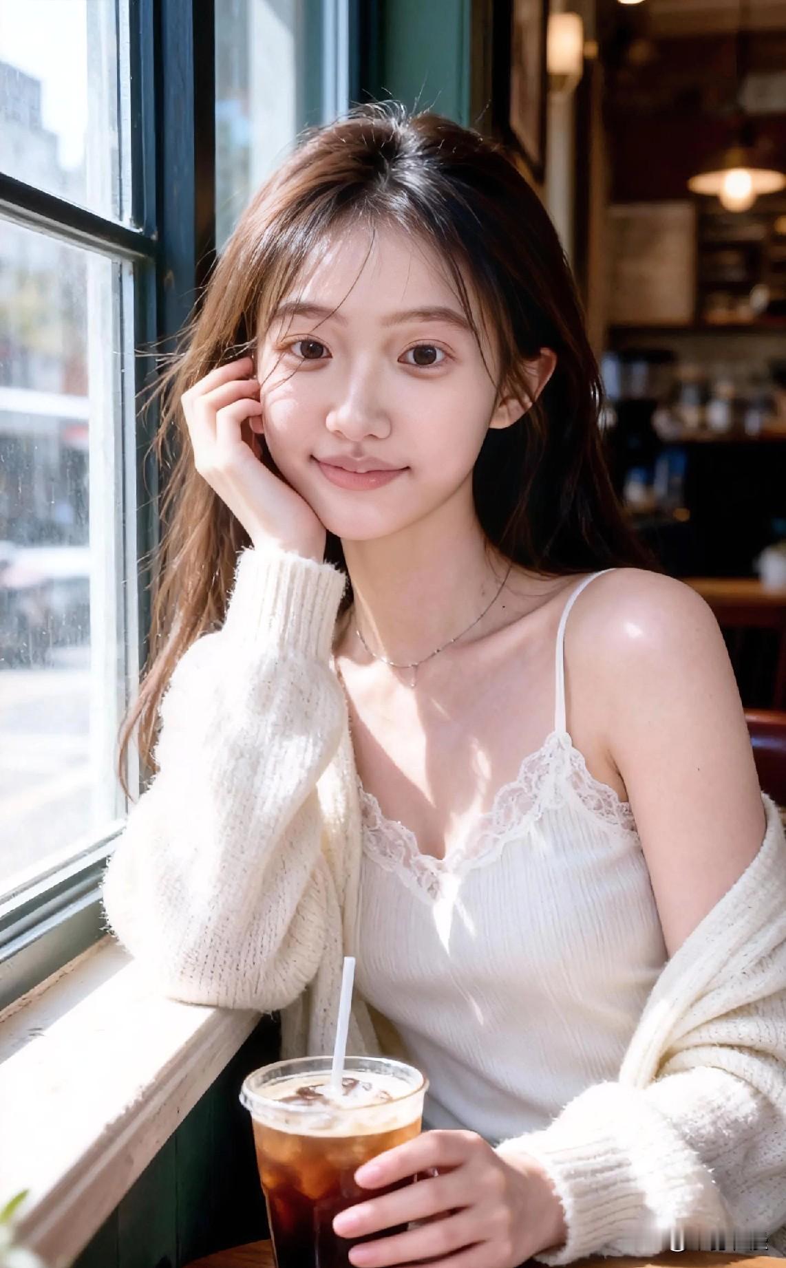 阳光洒进咖啡馆,少女轻抚发丝,享受悠闲时光。