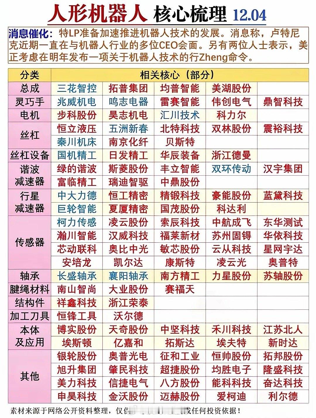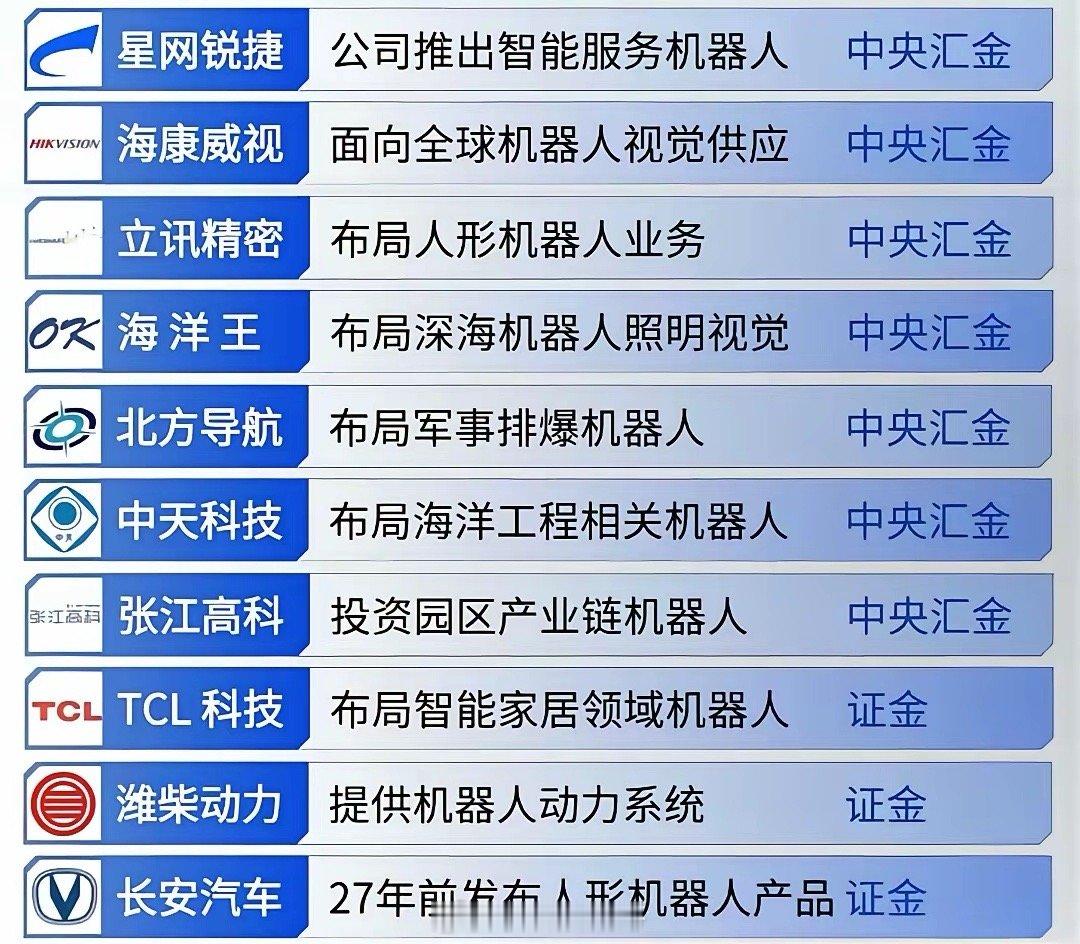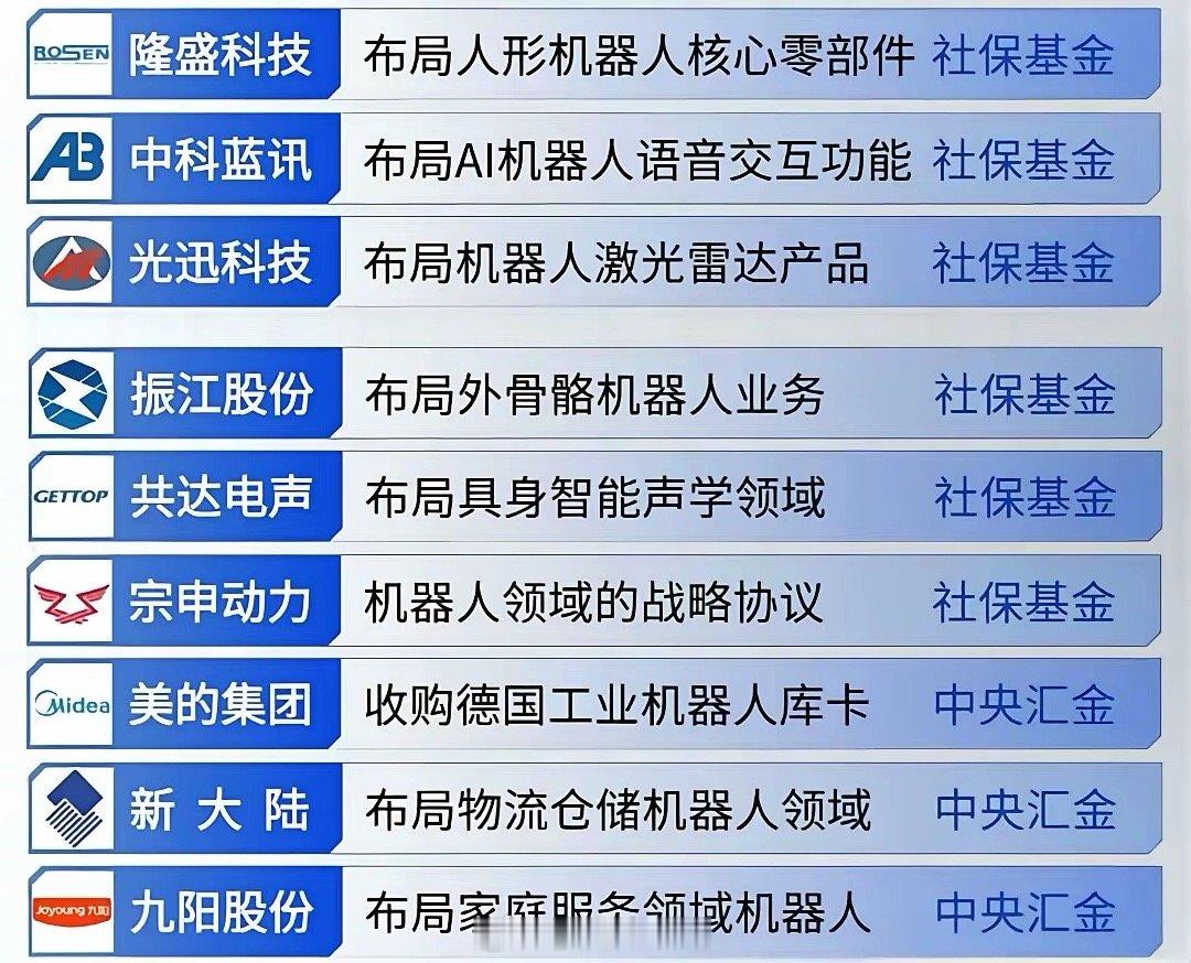 国家队布局机器人概念公司梳理!2025年12月4日,美政府在推动AI发展后转向聚焦机器人,美股机器人概念股走强,iRobot收涨74.36%!A股国家队重仓的机器人概念龙头有哪些?机器人赛道的国家队社保、汇金、大基金齐进场。从三花智控的机器人零部件,到美的集团收购库卡,从海康威视的机器人视觉,到北方华创的AI芯片……人形机器人赛道又迎重磅催化!从总成、灵巧手到传感器、减速器,这条产业链的核心标的都给你理清楚了放在下面图片里,相关环节的机会值得重点关注~理财有风险入市需谨慎,资料取材网络仅供参考。