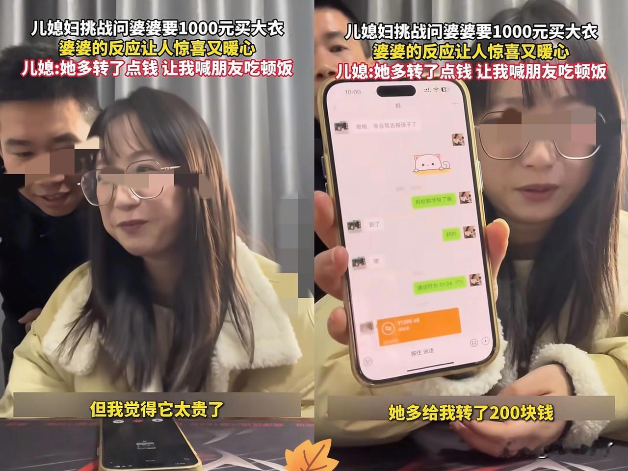 南京一女子跟风挑战问婆婆要1000块买大衣,本是抱着试试的心态开口,没想到婆婆秒回“喜欢就买,钱不够我转你”,转头就收到1200块转账,直接把人暖到眼眶发酸! 更戳心的是,婆婆自己袜子破了补补还在穿,对儿媳却大方得毫无保留,多转的200块还特意叮嘱她喊朋友吃顿好的! 总有人说婆媳是“天敌”,可这场双向奔赴的温柔,狠狠打脸了这种偏见!好的婆媳关系从不是刻意维系的表面和睦,而是婆婆把儿媳宠成孩子,儿媳把婆婆放在心上! 婆婆省吃俭用从不委屈儿媳,儿媳也把婆婆的付出看在眼里、记在心里,想着加倍回报。没有勾心斗角,只有真心换真心,这样的相处模式,怎么会有矛盾? 其实婆媳相处哪需要什么“秘籍”,不过是你真心待我,我便全力以赴。那些鸡飞狗跳的婆媳矛盾,缺的从来不是妥协,而是这份毫无保留的真诚与包容!