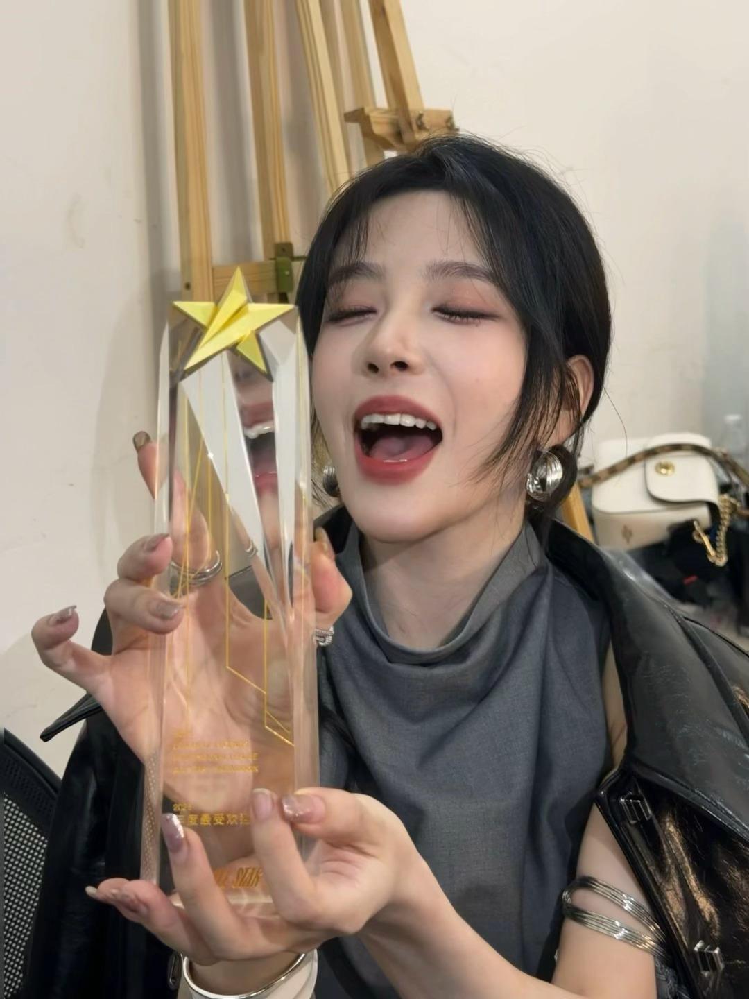 虎扑12月06日讯解说Rita荣获2025年度LPL最受欢迎解说,Rita分享与奖杯合照,配文:欢乐小塔!!!!!谢谢!!!!!