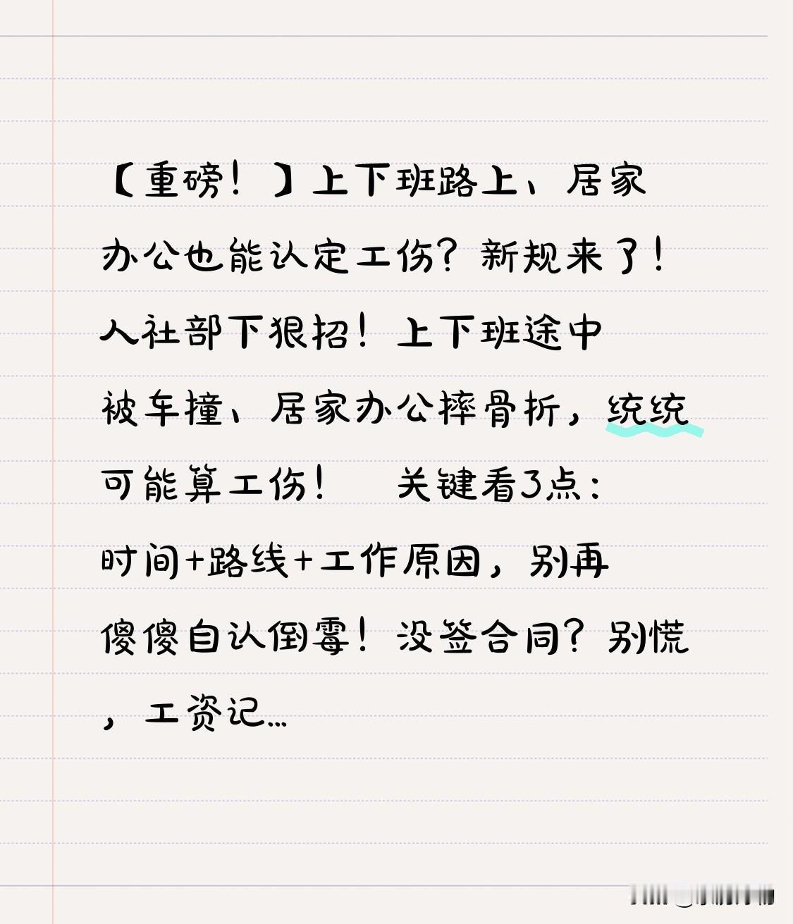 【重磅!】上下班路上、居家办公也能认定工伤?新规来了! 人社部下狠招!上下班途中被车撞、居家办公摔骨折,统统可能算工伤! ⚡关键看3点:时间+路线+工作原因,别再傻傻自认倒霉! 没签合同?别慌,工资记录、工牌、聊天记录都能当证据! 评论区聊聊:你受过工伤吗?哪儿伤了?一起支招维权! 工伤 工伤判定标准 工伤规定 职工工伤认定 上班工伤 工伤流程 认定工伤流程 工伤新标准 工伤新定义 工伤认定期限 工伤政策 工伤等级认定 工伤有效证据 工伤工资计算 上下班路上工伤