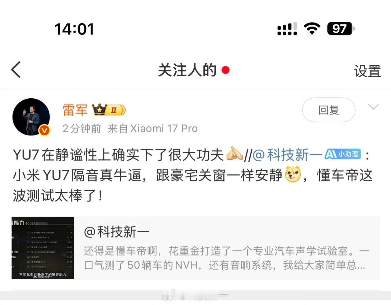 科技新一:兄弟们,请把排面打在公屏上[笑哭] 雷军转发了科技新一的评论,这对于一个自媒体博主来说,无疑使自己的流量和影响力又得到了扩大。 发现雷军还真的挺喜欢转发这些东西的,大家测评小米的内容测评的又比较好,同时又非常正面的测评雷军的社交账号运营团队看到之后确实会转发的。 各位是怎么看的?欢迎评论区留言。