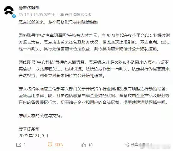 汽车民生 【赔偿道歉!诋毁蔚来汽车,自食其果】蔚来法务发布,多个网络账号因恶意诋毁蔚来被判赔偿道歉。官方直接点名了网络账号“电动汽车叨逼叨”、“中文科技”。官方指出:网络账号“电动汽车叨逼叨”等持有人苏楚元,自2023年起在多个平台以专业解读财务报告为名,恶意攻击蔚来经营及财务状况,借此实现违规引流、不当牟利。经法院一审判决,其行为侵害蔚来合法权益,判令其向蔚来赔偿并公开赔礼道歉。蔚来曾在去年12月公布了对一批违法侵权账号提起诉讼,该批违法侵权账号中就有“电动汽车叨逼叨”。网络账号“中文科技”等持有人谢贤胜,恶意编造并多次散布涉及蔚来的资本市场不实信息,以此博取关注、违规引流。法院近期作出一审判决,认定其行为侵害蔚来合法权益,判令其对蔚来赔偿并公开赔礼道歉。民生絮语:网络无法外之地,言论当守法有德!网络言论不是敛财的工具,也不是泄愤的机器,更不是“宫斗”的利刃。当前以及今后很长一段时间,不法言论依然会充斥整个网络,一旦泛滥,必酿灾祸。希望有关部门别松劲,加强监管,刻不容缓;鼓励有责任的企业,拿起法律的鞭绳,抽之;奉劝心术不正之人,别把路走偏!欢迎探讨汽车民生话题!!!