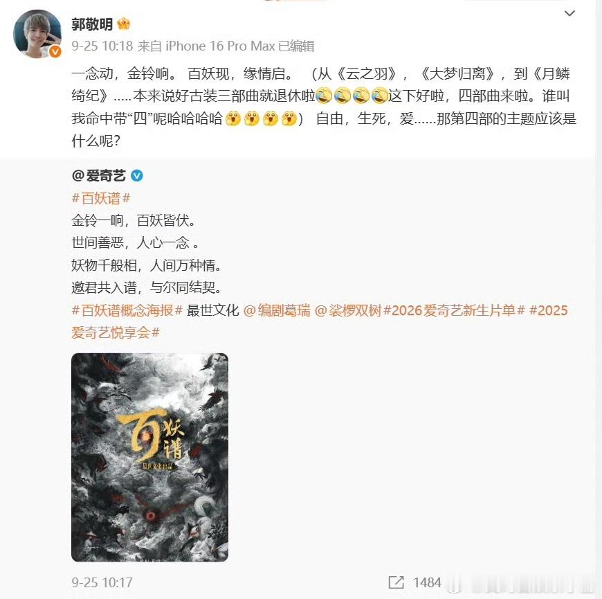 邓为 郭敬明互关!此前邓为说自己要有新角色,郭敬明转发《百妖谱》概念海报,两人是